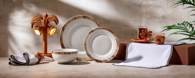رُطَب، تصاميم مستوحاة من النخيل والصحراء، بألوان طبيعية ولمسات خضراء وزرقاء تجمع بين التراث الأصيل وروح التصميم المعاصر، تضم أدوات مائدة وديكور تضفي سكينة وانتعاشًا على مائدتك.