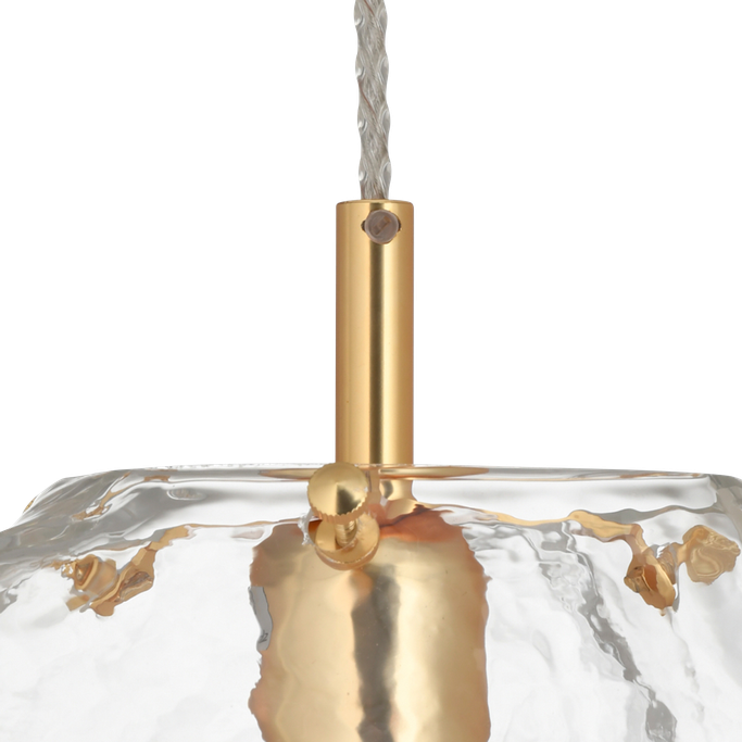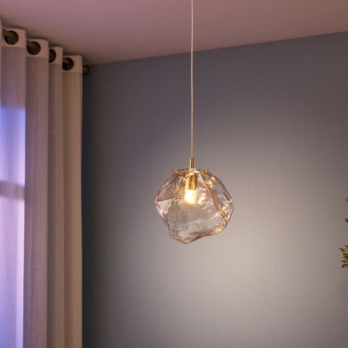 أناقة مشعة. أضف توهجًا ودفئًا لزوايا منزلك مع روك إضاءة معلقة. صمم على شكل صخرة بنتواءات ناعمة وينعكس على سطحها الضوء. صنعت من المعدن باللون الذهبي الآسر والزجاج الشفاف.