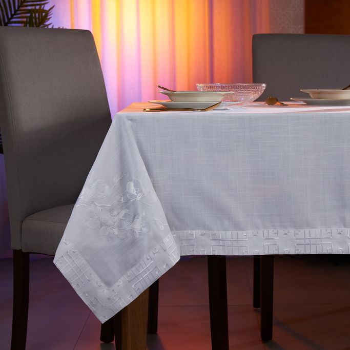 تجربة آسرة. دع الهدوء يغمر حواسك وتأمل الفخامة الممتدة على طاولتك مع فرندا مفرش طاولة. حوّل جمعاتك وقت الطعام إلى تجربة آسرة وساحرة لضيوفك. صمم المفرش بشكل أنيق وبتطريز فاخر على الحواف يلائم بهاء مائدتك. صنع من البوليستر وباللون الأبيض النقي ليعطيك إحساسًا بالأناقة الخالدة. استخدم هذه القطعة في منزلك كذكرى ثمينة.