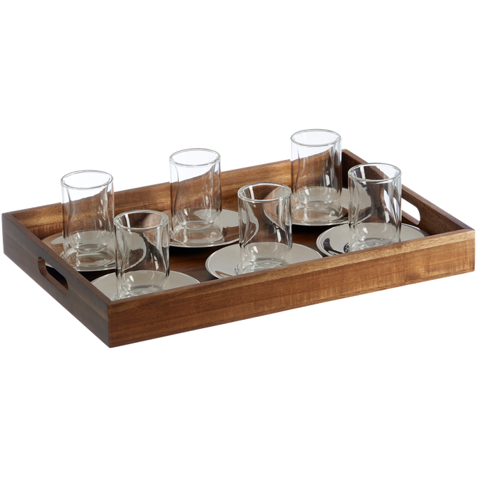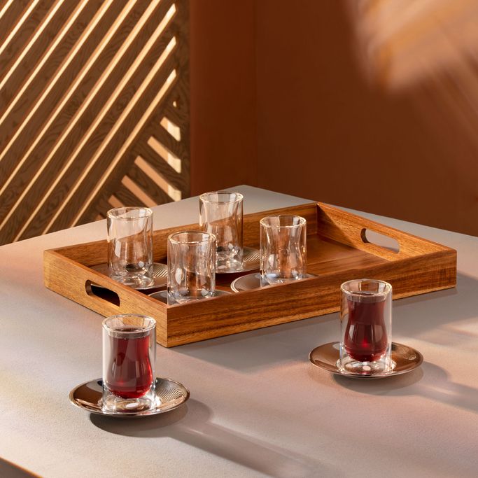 في أحضان الطبيعة. دع الهدوء يغمرك وتنفس سحر الطبيعة الخاص مع أثينا طقم فناجين شاي مع صينية. صمم الطقم من صينية تقديم تحتوي على فناجين شاي مع قاعدة للاستمتاع بكوب شاي لذيذ. صنعت المجموعة من صينية من الخشب وفناجين من الزجاج المزدوج وقاعدة معدنية باللون الفضي. استمتع بالسلام والجمال في أحضان الطبيعة.