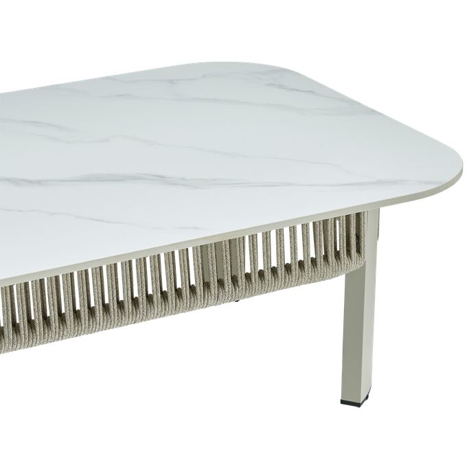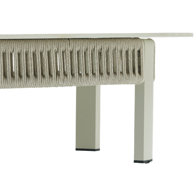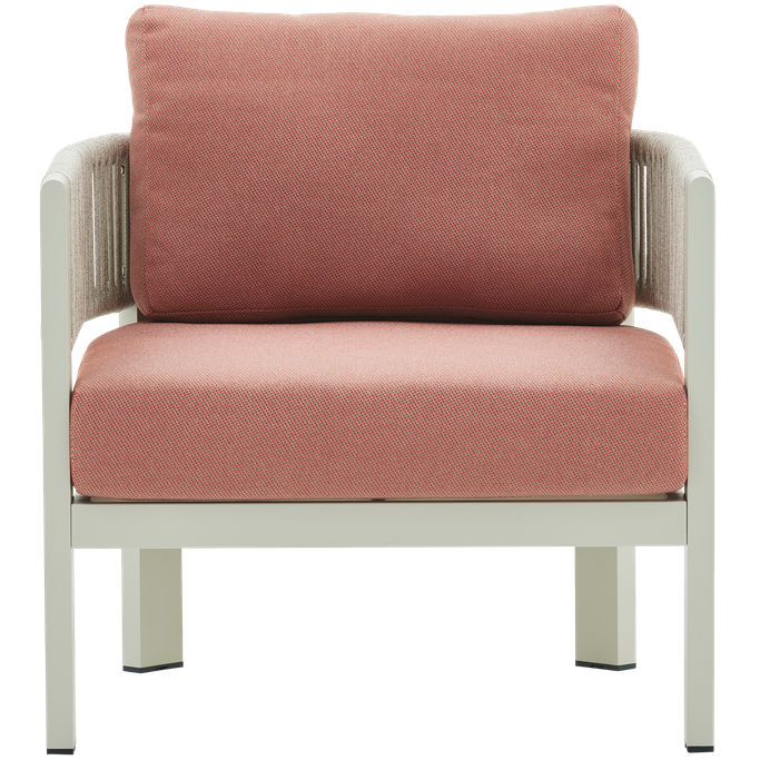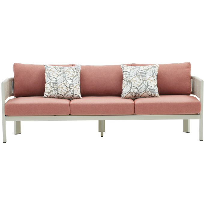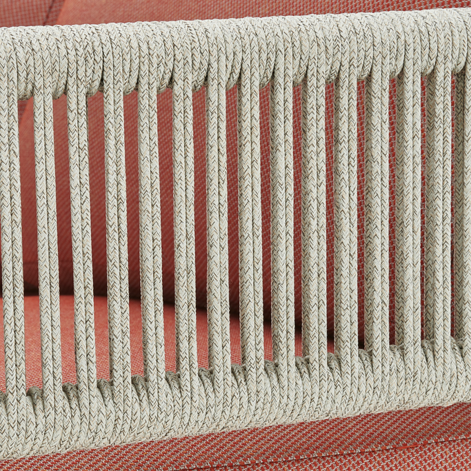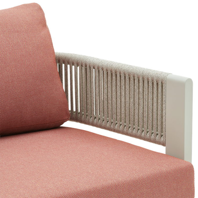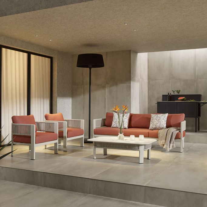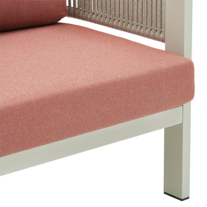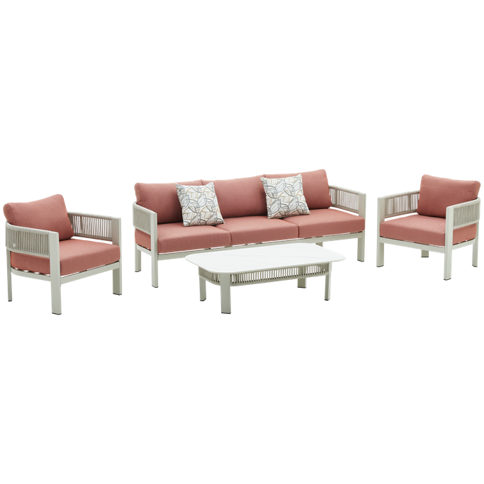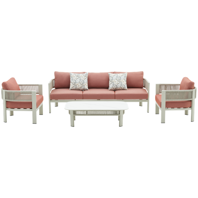 نسيم عليل. يهمس في أجوائك بالا طقم كنب، صُممت ليمتزج جمال التصميم مع راحة الاستخدام. يضم الطقم صوفا فسيحة وكرسيين بذراعين؛ وطاولة قهوة لعرض مشروباتك، مع خيار إضافة مقعدين لجلسات أوسع. صُنعت هذه القطع من الألومنيوم باللون البيج للهيكل والأذرع المنسوجة من الحبال لتضفي لمسة من الأناقة، وقماش الأوليفين باللون الخوخي الهادئ. لحظات لا تنسى في الهواء الطلق.