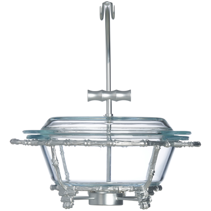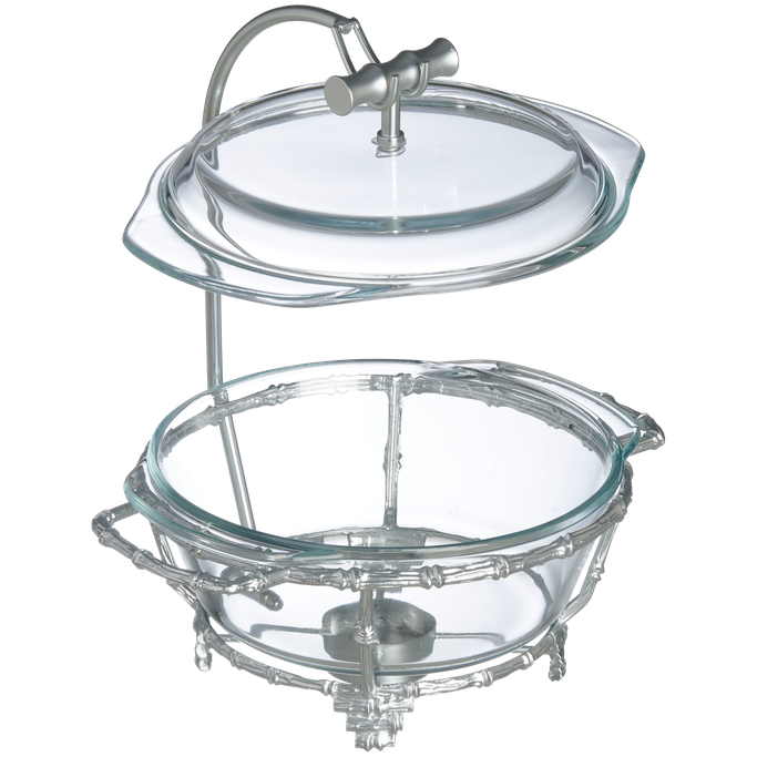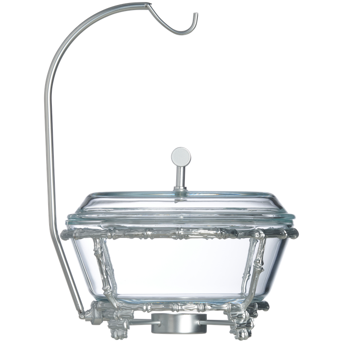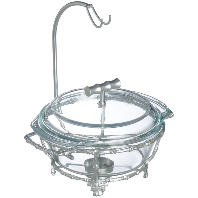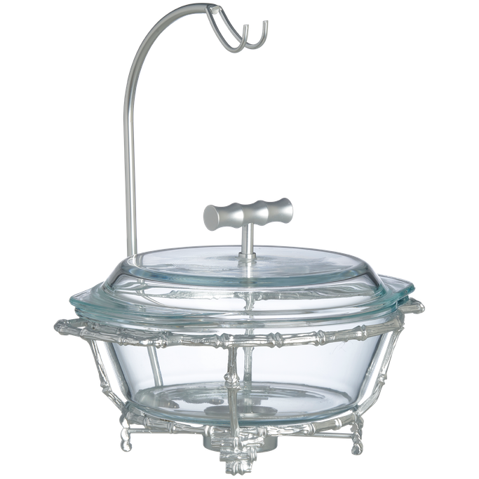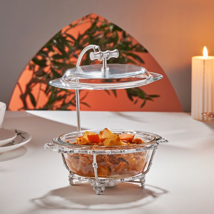 تزدان الموائد الرمضانية وتكتمل الأطباق الشهية مع تغريد طبق تقديم. صمم بوعاء دائري وغطاء بمقبض أنيق، يستقر على حامل بزخارف راقية وأرجل متناسقة. صنع من الزجاج الشفاف وسبائك الزنك باللون الفضي. امنح كل وجبة حضورًا يتحدث عن الذوق والابتكار.