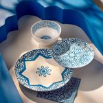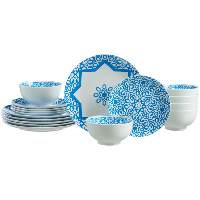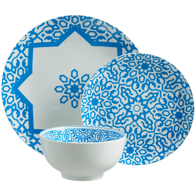 أسرد قصص المدينة الزرقاء مع شفشاون طقم أواني الطعام المستوحى من تراث الأزقة المغربية. صمم الطقم بتفاصيل هندسية عريقة تزين الأطباق بزخارف متموجة ومتشابكة، تتوسطها نجمة تقليدية مشرقة تُعيدك إلى سحر العمارة المغربية. صنع من الخزف الصيني باللونين الأبيض النقي والأزرق الآسر الذي يعكس زرقة مدينة شفشاون. جهز مائدتك واستقبل لحظات رمضان بحس من الأصالة والجمال الآخاذ.