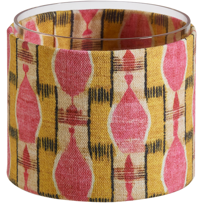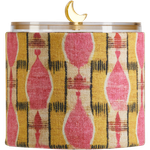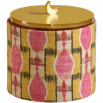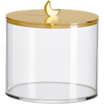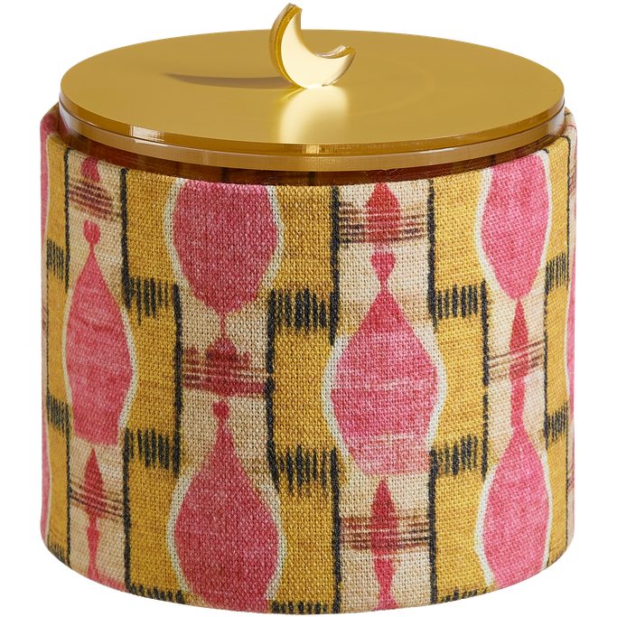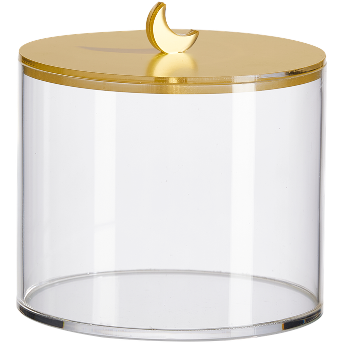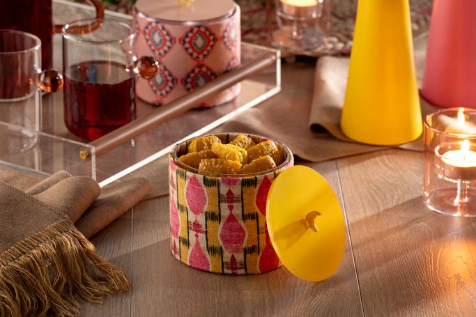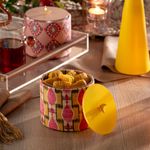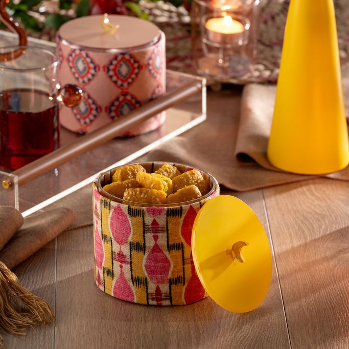 أضف لمسة من البهجة إلى ضيافتك مع زيانه جرة تخزين. صُممت بهيكل دائري أنيق يحيط به غلاف خارجي مزخرف بنقوش زاهية، مع غطاء يعلوه هلال لسهولة الفتح والإغلاق. صُنعت من الأكرليك الشفاف والقماش باللون الأصفر. قدّم القرقيعان بفرحة أو احفظ مكسراتك بأناقة.