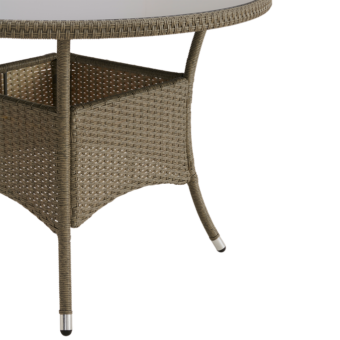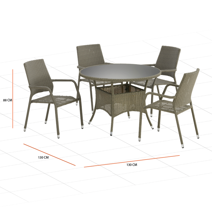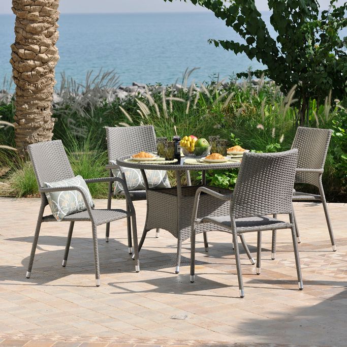 وسط الطبيعة. استمتع بوجبتك في أجواء دافئة وسط الطبيعة مع ستنافورد طقم طاولة طعام. دع حديقتك تزدهر بتفاصيل هذه المجموعة التي ستأخذك إلى حفلة طعام مثالية. صمم ليعكس جمال لحظاتك المريحة والعائلية بأسلوبه الريفي الأنيق وتفاصيل الراتان الجذابة. أُستوحي التصميم من أناقة مدينة ستانفورد ولمساتها العصرية ليضفي مظهر دافئ لا ينسى في حديقتك. يحتوي الطقم على أربعة كراسي وطاولة طعام لتسترخي بارتياح في الهواء الطلق. مصنوع من الفولاذ والراتان والزجاج بلون رمادي لإضفاء لمسة مُلفتة. استمتع بصحبة عائلتك في مساحتك الخارجية.