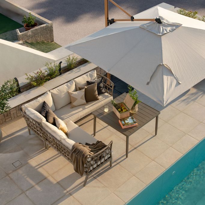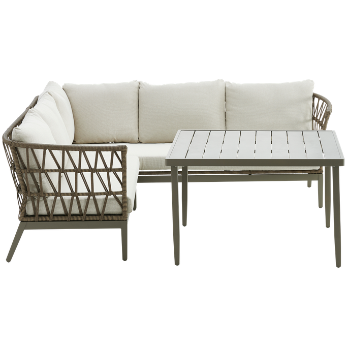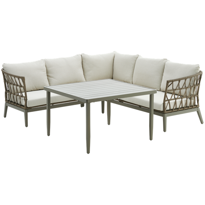 ملتقى الأحباب ومنبع الذكريات الجميلة مينيماليست طقم كنب. صُمم بأناقة متقنة، يضم كنب ثلاثية ومقعدين فرديين بوسائد مريحة ولمسات خشبية دافئة على الذراعين، إلى جانب طاولة مستطيلة متناغمة تلبي احتياجات الضيافة. صُنع من الألومنيوم والقماش بمزيج متناسق من البيج والأبيض. ابتكر مساحتك الخاصة لتجمع أجمل الأحاديث والذكريات.