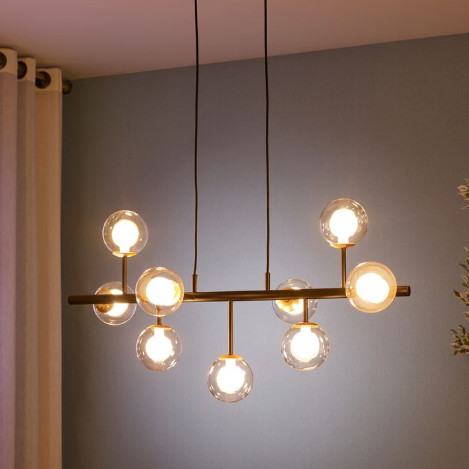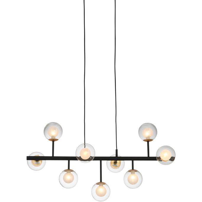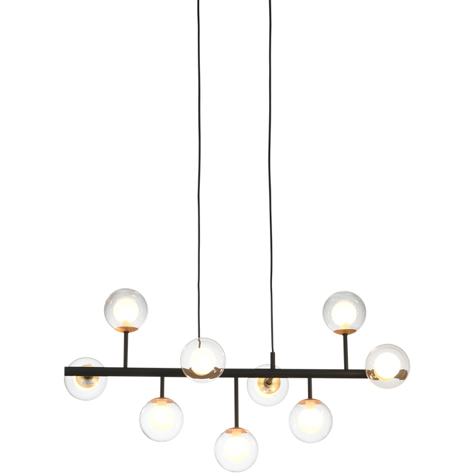 Illuminate Your Space With A Distinctive Style with KK Pendant Light. Designed with an elegant horizontal arm, from which glass orbs are harmoniously arranged on flexible suspension wires. Made of metal in black and gold with transparent glass orbs. Add a touch of creativity and shine to your ceiling.