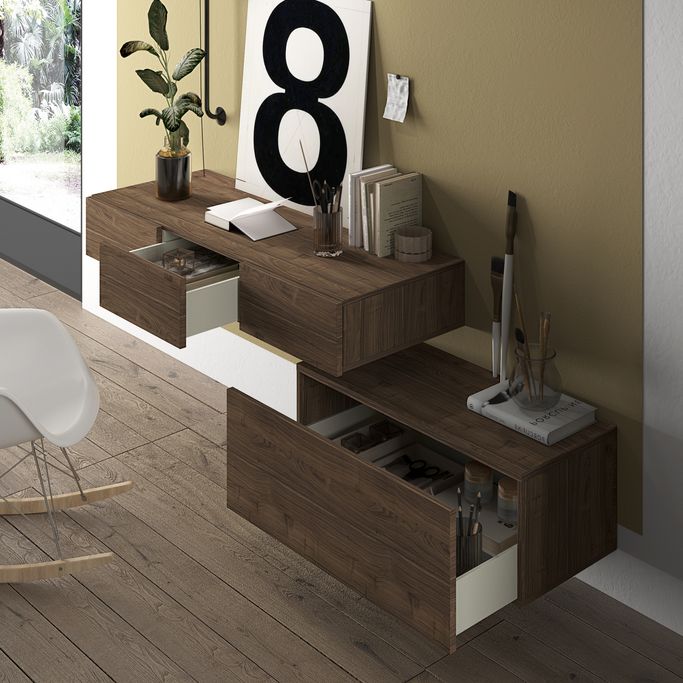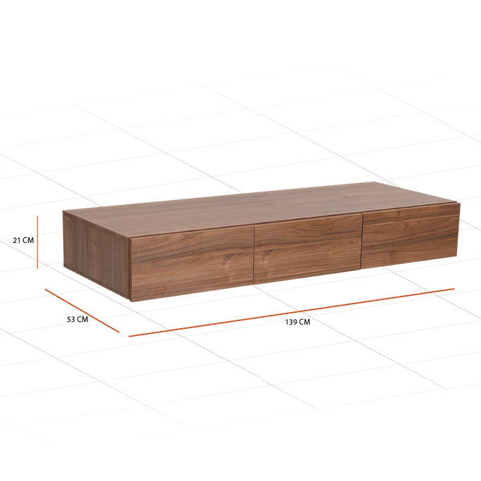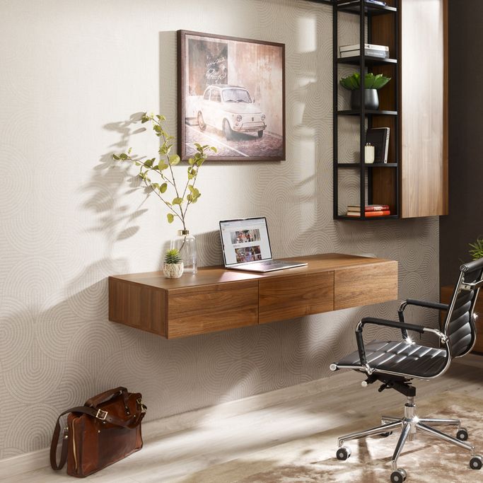 Cozy Glance. Add a cozy mood to your interiors with the stunning Vecco Wall Desk Unit. It can be used as a space-saving creative desk. Designed to be set on the wall with 3 drawers. It is made of melamine in a walnut color. Embrace the new farmhouse waves in your home.