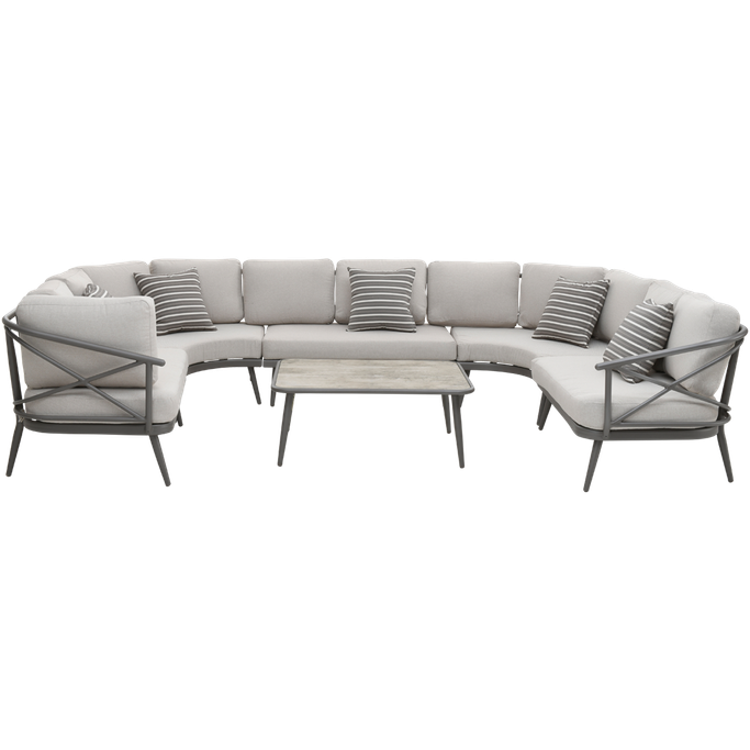 Twinkling Stars. Contemplate the beauty of the moon amidst starry nights and sweet conversations with Unity Sofa. The perfect exquisite blend of authenticity and grandeur makes your outdoor living area beautiful to the fullest. Designed in a u-shape to host your large parties with all its splendor and charm. Relax with its comfortable cushions that provide the best backrest support. The set includes ten seats and a large center table suitable for big gatherings. It's made of aluminum structure and fabric in beige and grey colors to impress your guests with a spectacular display. Outdoor spaces are beautiful when they're shared with good company.