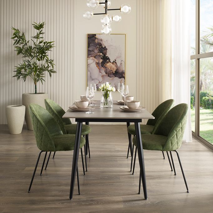 In the moment of love and togetherness, you will find the stunning Mei 4 Seats Dining Table Set. It will delicately complete the minimalist aesthetic of your interiors. Designed with a table and four chairs in a modern style. It is made of ceramic and steel in green, black, and white colors that perfectly elevate your décor. Have a tasty meal and a joyous experience.