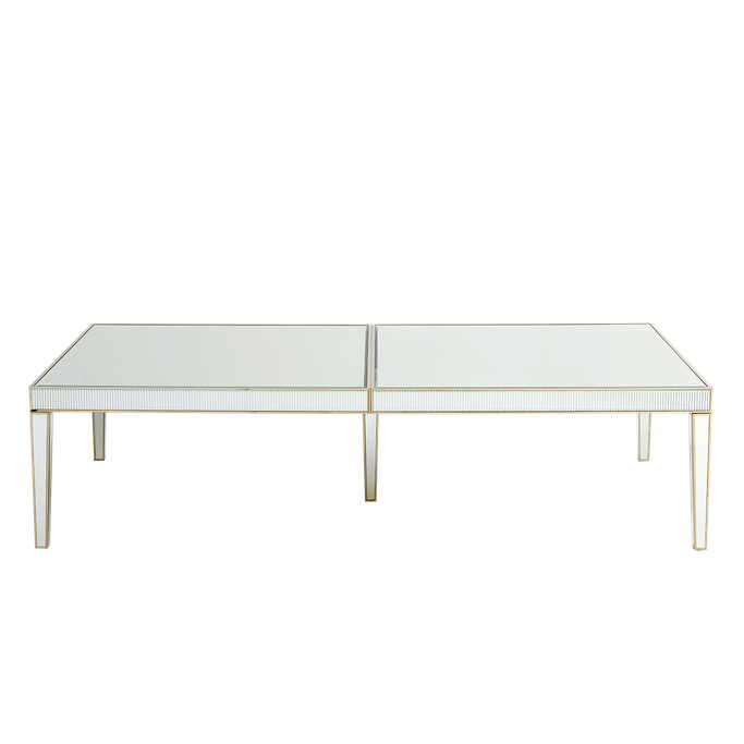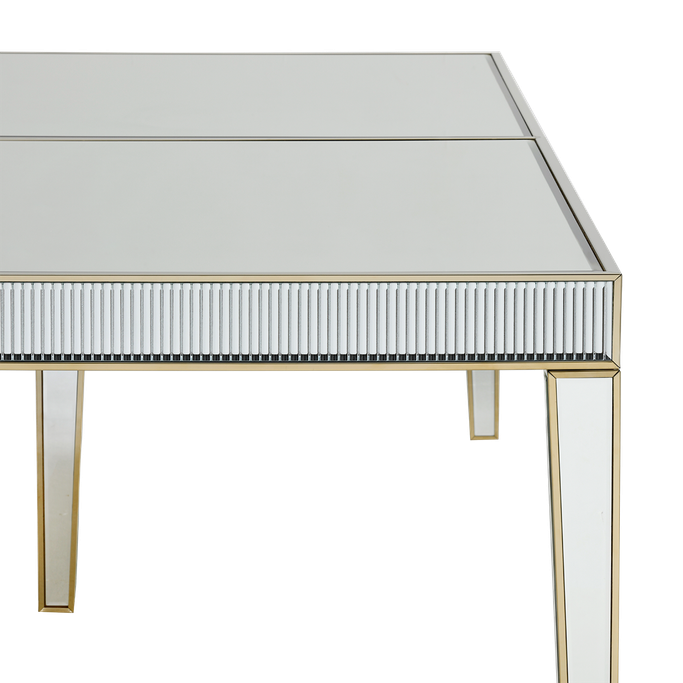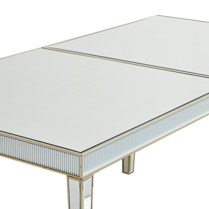 Luxurious Lifestyle. With the glamour of the Prisma 12 Seats Dining Set, you'll enjoy a luxurious lifestyle. In a world of design and shimmering hints, you'll have an immersive dining experience. Designed with a reflective mirror on the surface to shine brightly in the light. From the golden handles on the chairs to the curved edges of the table, every detail is impeccable. It is made of metal and mirrors in golden and beige colors. Become the center of a radiance gathering.