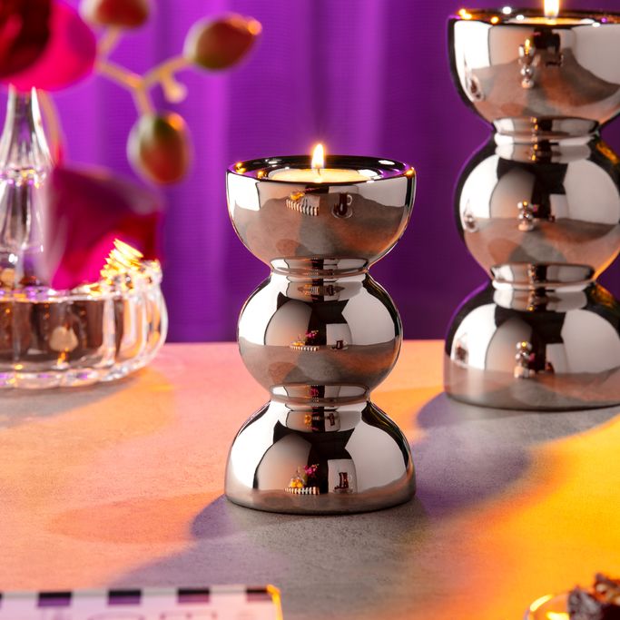 A Serenity Haven. Observe tranquil moments that fill the air with Avriel T Light Holder. Dim the lights and let the candles illuminate your home's beauty. Designed with curves and a vertical form to provide a magical scene. It is made of ceramic in a glossy silver tone to reflect the sparkle of memories. Turn your evenings into a calm oasis by surrounding yourself with the soft flicker of candlelight.
