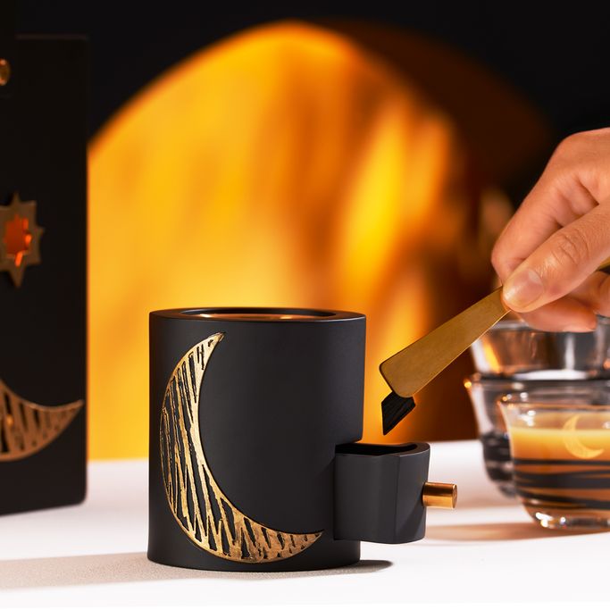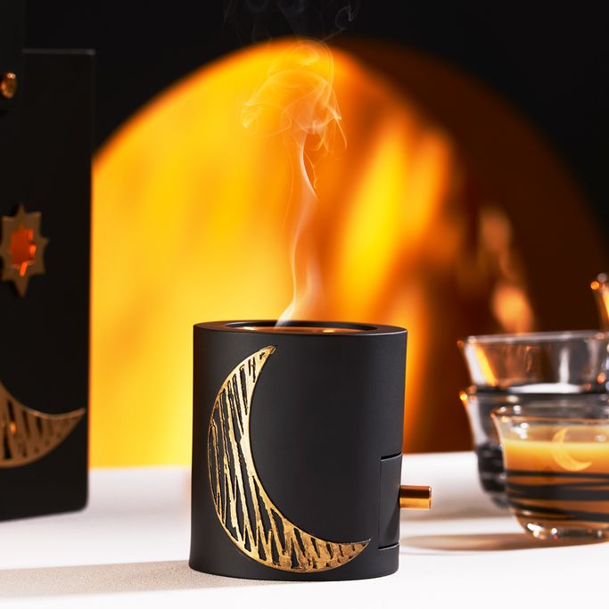 Atmosphere of Tradition and Spirituality. Spread joy and luxurious scents in every corner with the rising smoke of incense using the Hal Hilalah Incense Holder. Designed cylindrically with a holder for incense and a compartment for storage. It is made from ceramic and metal to withstand heat, in an elegant grey color with a crescent moon pattern in stylish gold.