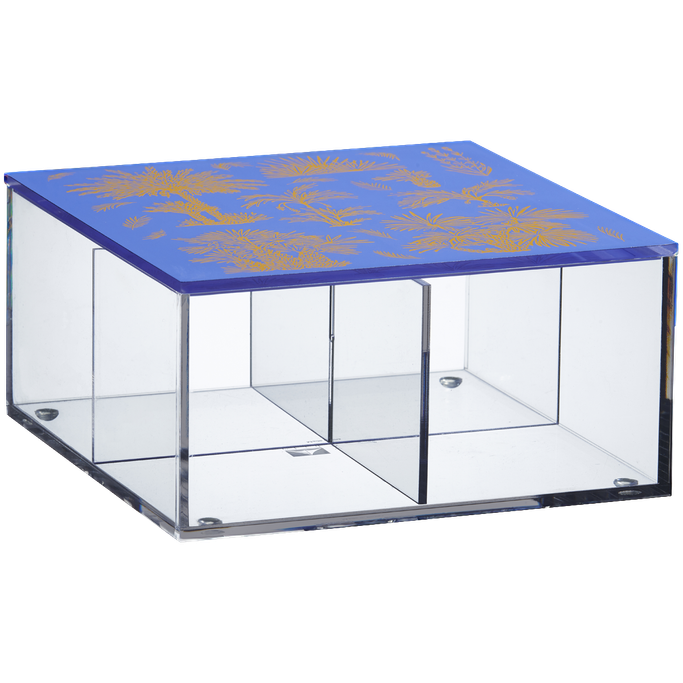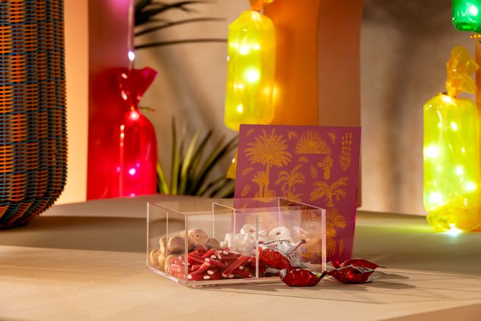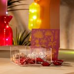 Let Gergean melodies fill your gatherings with Gergean - Nakheel Storage Jar as your celebration essential. Designed with a sophisticated square profile and practical internal dividers for sweets and nuts organization, adorned with graceful palm patterns on the lid. It is made from clear acrylic in a maroon and golden color lid that radiates festive charm. Transform your Gergean treats into treasured moments of joy.