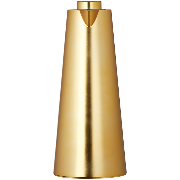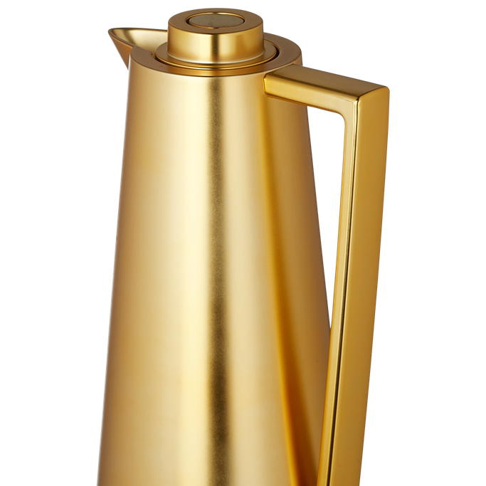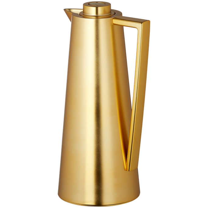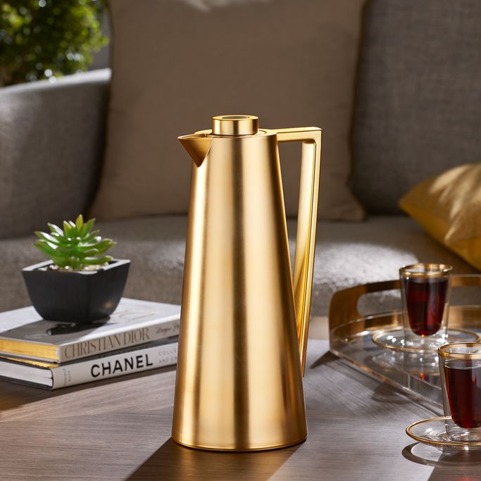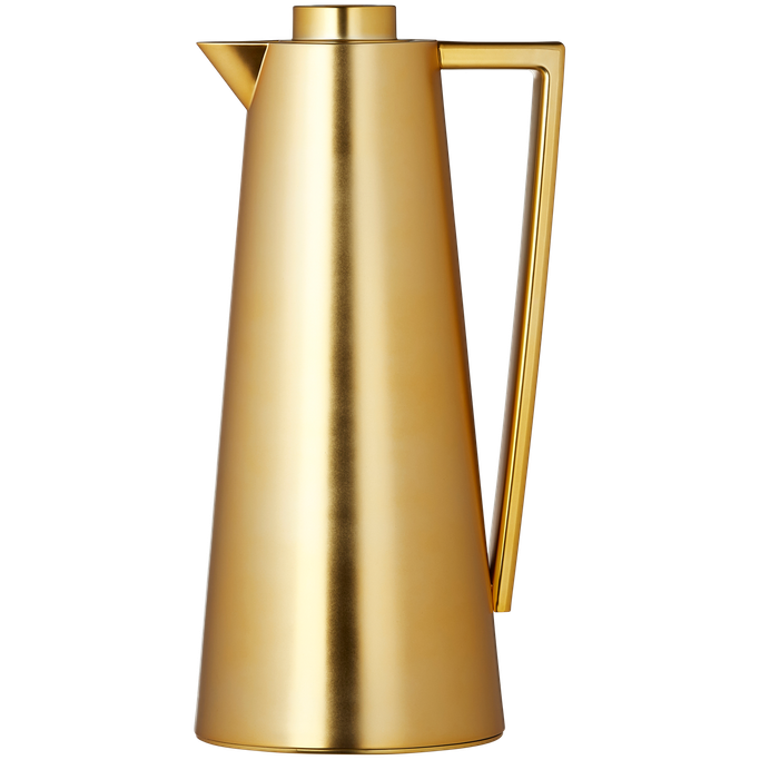 Where warmth meets sophistication, the Sherifa Server stands as a testament to refined entertaining. Designed with a graceful conical body, complemented by a sleek linear handle and a precision-fitted crown lid. It is made from plastic in a golden color and temperature-preserving glass. Let every pour become a celebration of gracious hosting.