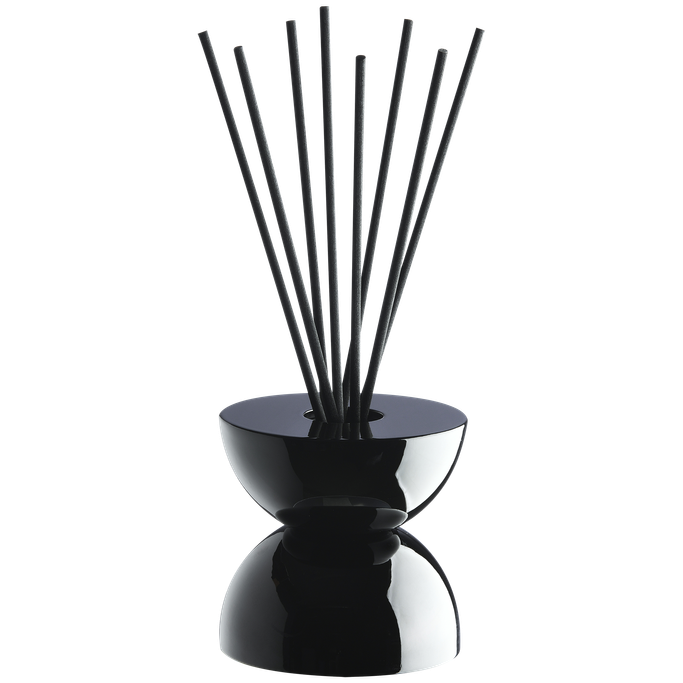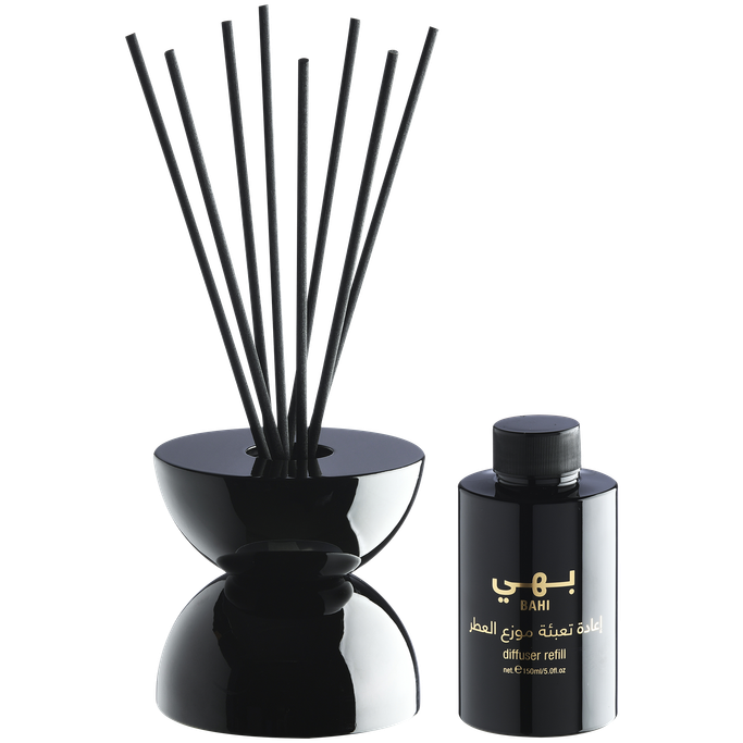 Let the scent of elegance fill your space with the Bahi Diffuser. Its top notes feature green fruity and orange flower, followed by a rich heart of jasmine, ginger, caramel, and floral notes, settling on a base of amber, woody, and vanilla. This blend brings warmth and sophistication to any room. Designed with an attractive geometric shape and made from glass and plastic in a black color, it also comes with an extra refill bottle for a fragrance that lasts. Give your home an unforgettable signature scent.