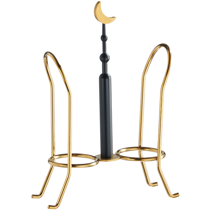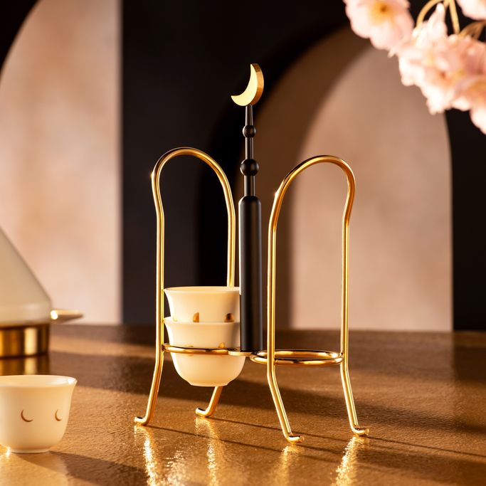 Redefine your Arabic coffee rituals with the Al-Hamah Gahwa Cup Holder. Designed with an elegant frame featuring two symmetrical side handles for easy carrying and a central column inspired by a minaret topped with a Ramadan crescent. It is made from stainless steel in golden and black colors. Let your coffee gatherings during the blessed nights be filled with authenticity and beauty.