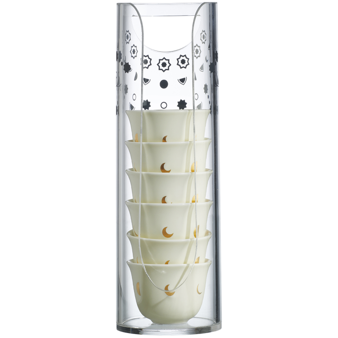 Shine while serving your Arabic coffee with Al-Hamah Coffee Set. Designed with elegant cups adorned with Ramadan crescent patterns, and a cylindrical holder decorated with unique details inspired by jewelry. It is made from clear acrylic, while the cups are made from ceramic in white and golden colors. Serve your coffee in a style worthy of your gatherings.