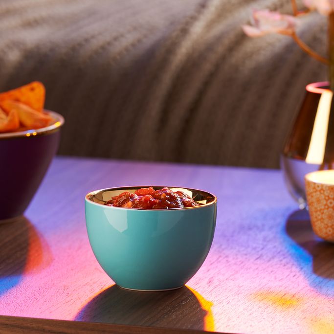 Colorful Andalusian Fair. Andalusia Dipping Bowl is a visual expression of joy and uniqueness. In the shade of happiness, it reflects a distinctive hue. With a prominent Andalusian influence, this colorful fair boasts a spectacular backdrop. Arrange your favorite dips on your table and enjoy the energy that will boost your mood. It is made of sky blue ceramic with a golden interior to cast a charm on your table. Bring a vibrant historical reflection into your home.