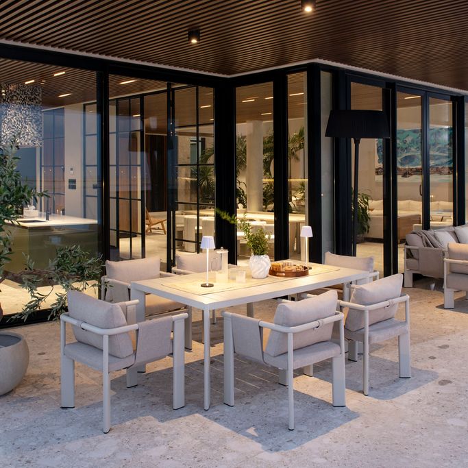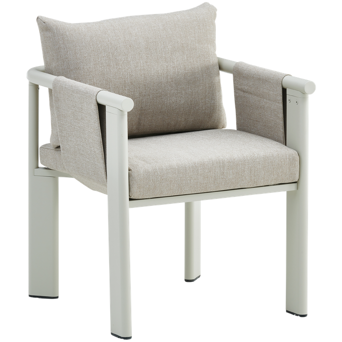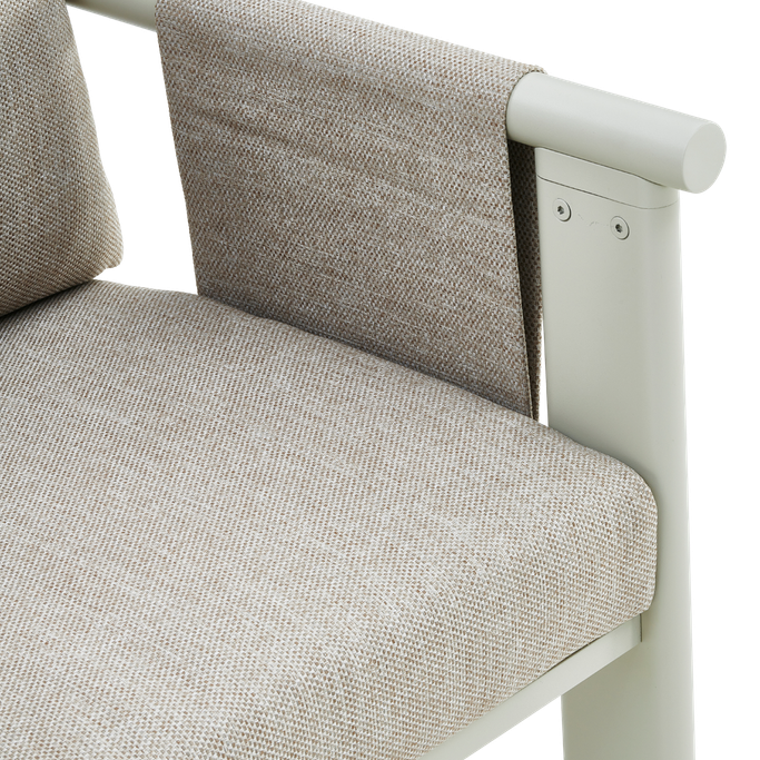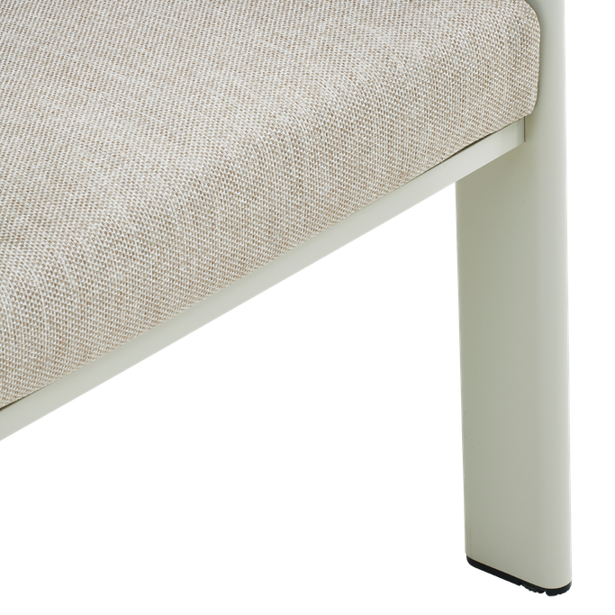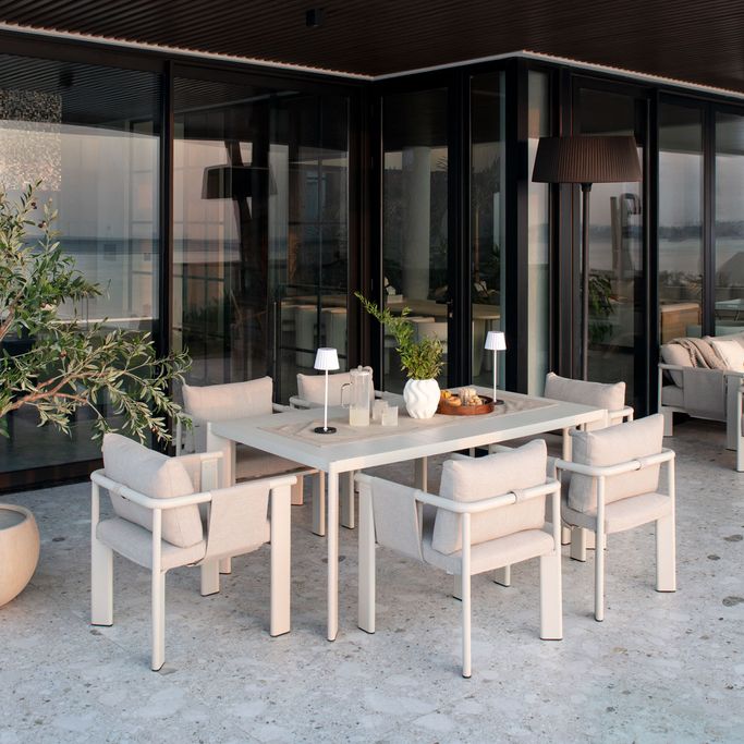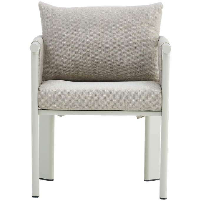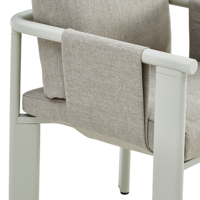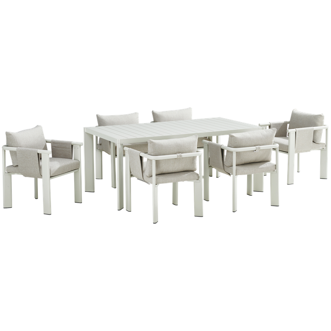 Discover delightful outdoor dining experiences with the Ligo Dining Set. Designed with a large rectangular table that comfortably seats six, the set features cozy chairs with armrests, along with seat and back cushions that provide exceptional comfort. It is made with sturdy aluminum frames and covered in high-quality olefin fabric in a warm beige tone. Make your evenings under the stars even more special with this set.