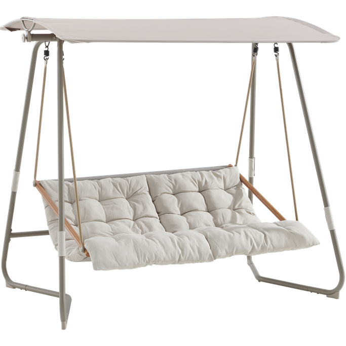 Enjoy peaceful evenings under the moonlight with the Luna Swing. Designed with a wide suspended seat topped with a protective canopy and a padded cushion that offers comfortable support. It is made from a sturdy steel frame in a greige color, with a cushion and canopy made from Olefin fabric in a beige color. Refresh your spirit with the gentle breeze and soft drizzle.