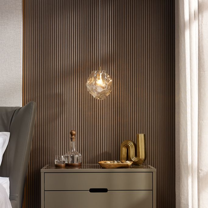 Radiant Elegance. Add a glow and warmth to your home with the Rock Pendant Light. Designed in the shape of a rock with soft contours that reflect the light on its surface. It is made from captivating golden-colored metal and clear glass.