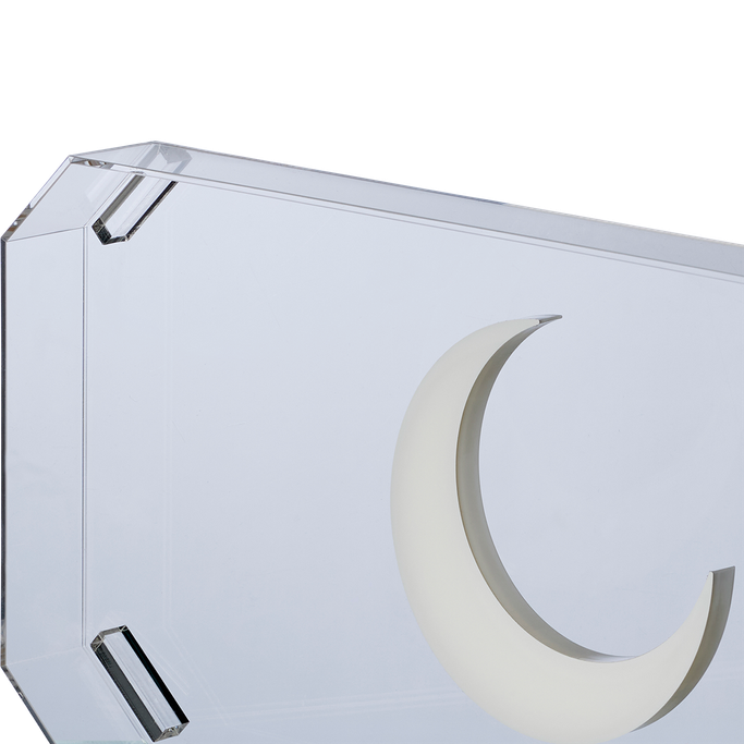Delicate Touches. Ponder a touch of luxury and distinction on your Ramadan table with Afaq Serving Platter. Designed in a geometric shape with high edges and elegant bases that combine beauty and practicality, with a crescent moon graphic on the base. It is made of transparent acrylic to ensure lightness and superior strength. Add your own touch to the table.