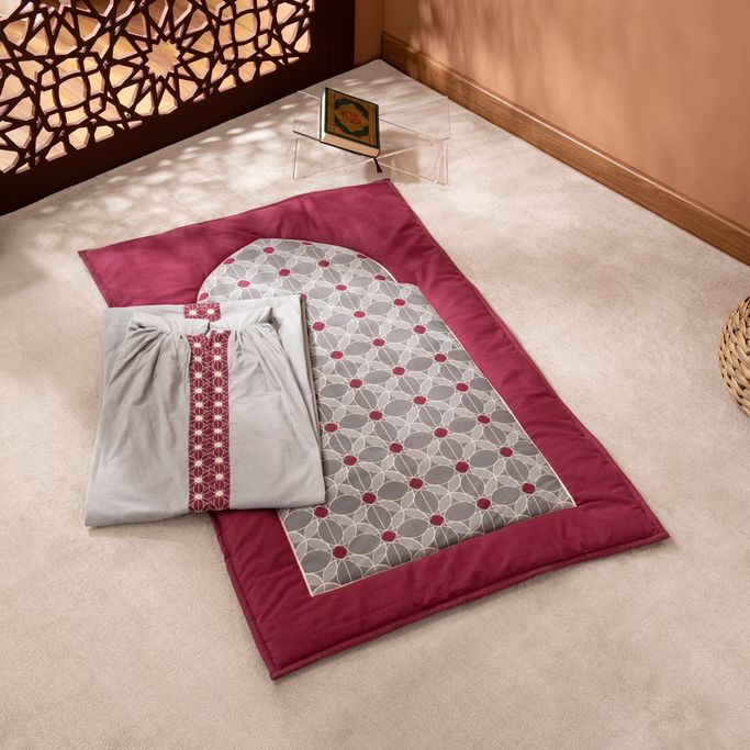 الخير يكمن في تفاصيل الحياة. استشعر لحظات الإيمان والطمأنينة في كل يوم مع مغربي ثوب صلاة. صممت المجموعة من قطعتين ثوب للصلاة بسحاب وسجادة بتصاميم إسلامية. صنع من البوليستر باللون الأحمر الداكن وبلمسات من اللون الرمادي.