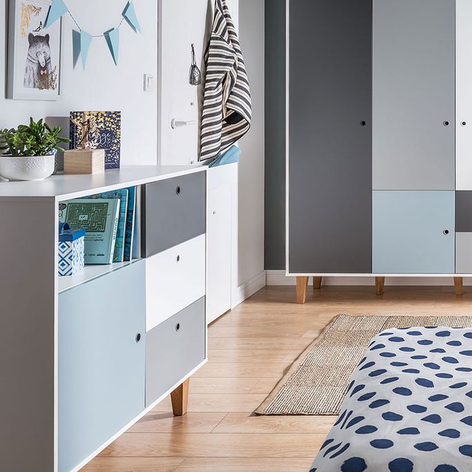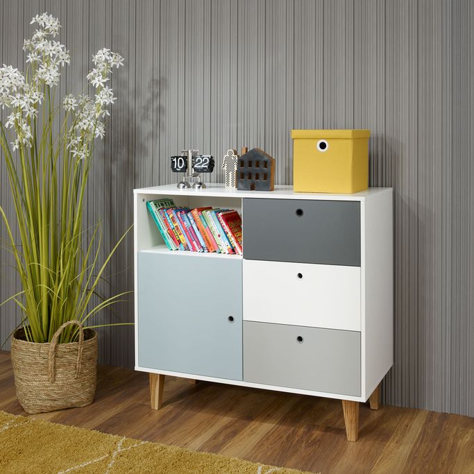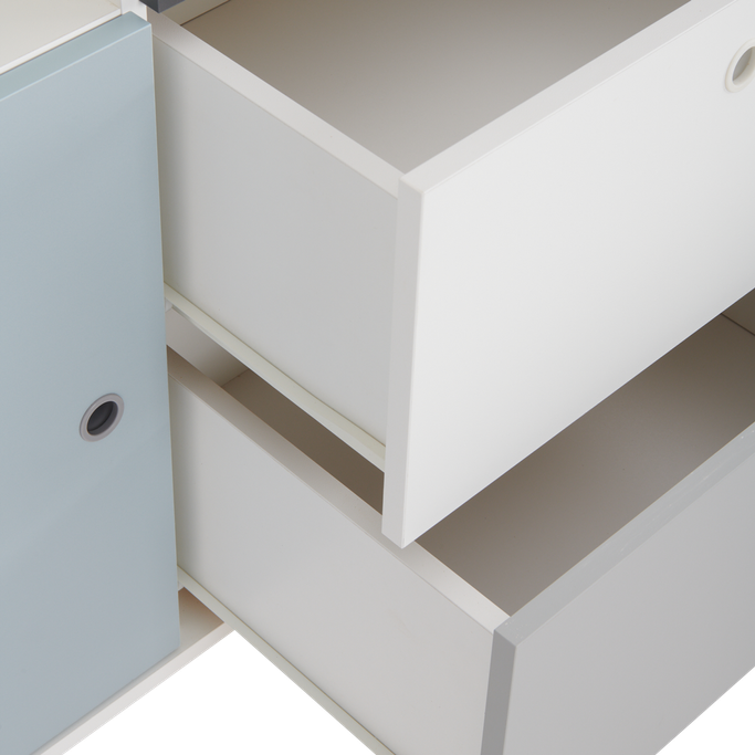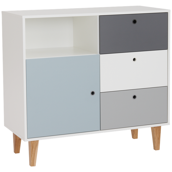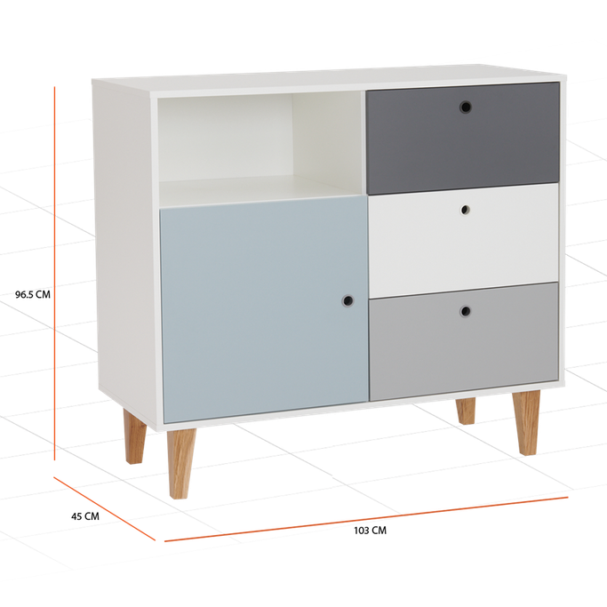 معرض فني. اكتشف اهتماماتك الجديدة وتفرد بأفكارك مع كونسبت خزانة ثلاثة أدراج. سيولد معرضك الفني الجديد في غرفتك من خلال تنسيق سطحها الفسيح. عبّر عن آمالك وأحلامك من خلال رفوفها واعرض روائعك وإبداعاتك. يوفر المقبض المجوف وصولاً سلسًا لمحتوى الأدراج. ستضفي أرجلها مساحة واسعة وستعكس جمال التفاصيل في الغرفة. صنع من الميلامين باللون الأبيض والرمادي والأزرق الفاتح لإبراز المظهر الآسر في الغرفة. ألهم روحك وارسم طموحاتك مع هذه القطعة الأنيقة.