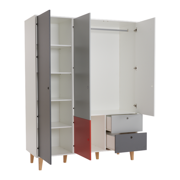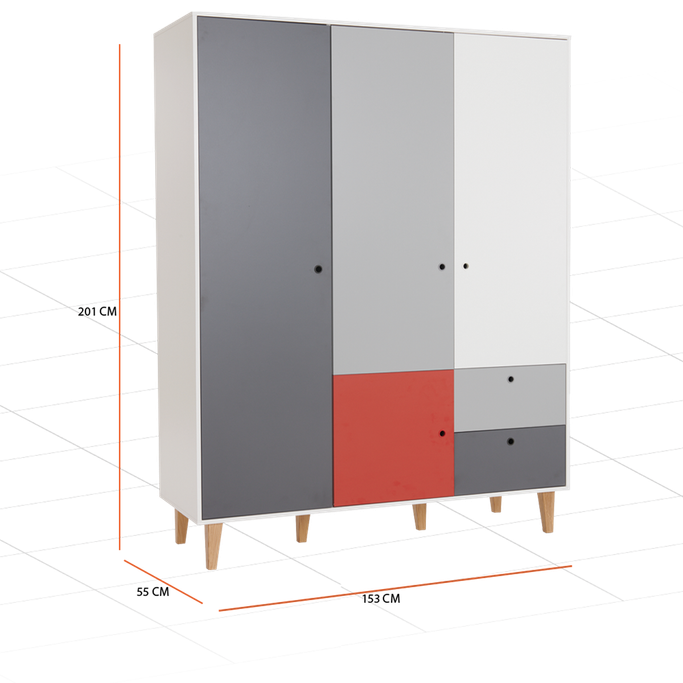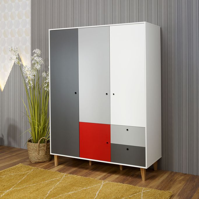 جمال الألوان. انغمس في لحظات مليئة بالجمال والأناقة مع كونسبت دولاب. كل لون سيعيد ملء روحك بمشاعر الشغف والنشاط. ستخلق أدراج الدولاب المختلفة مساحة مميزة تعكس حرية اختياراتك الفريدة. سيحتوي الدولاب على جميع ملابسك وأحذيتك وملحقاتك الشخصية بشكل مثالي. سيوفر المقبض المجوف وصولاً سلسًا لمحتوى الأدراج الفسيحة. ستضفي أرجله مساحة واسعة وستعكس جمال التفاصيل في غرفتك. صنع الهيكل من الميلامين باللون الأبيض والأبواب بالرمادي والخزانة بالأحمر لإبراز المظهر الآسر لمنزلك. دع نسمات الجمال تتألق في أرجاء الغرفة.