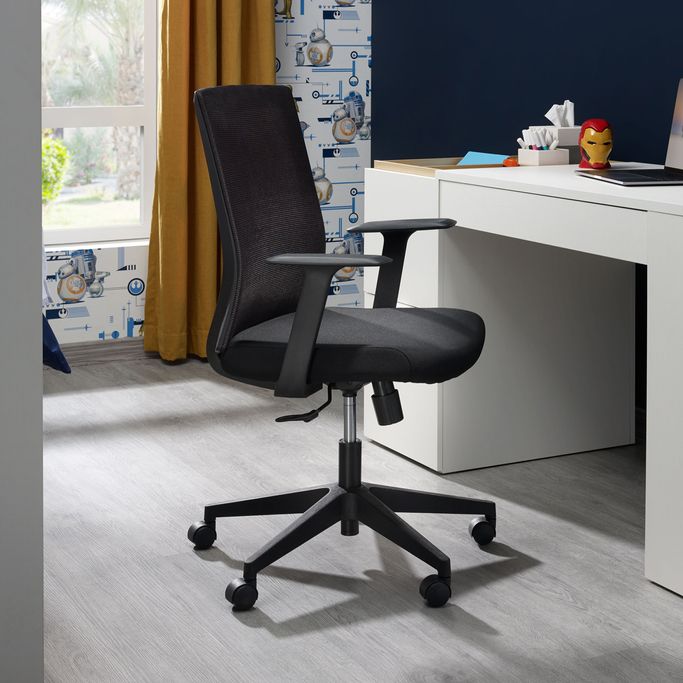 شرارة الشغف. اشعر بشرارة الشغف وحلق بأحلامك إلى السماء مع كرسي مكتب ألفا. حوّل روتين جلوسك إلى تجربة ممتعة مع مميزاته العملية ومظهره العصري. سيكون مكتبك المنزلي محور المنزل مع طابعه الأنيق ولونه الجذاب. يسمح مسند الذراع لكتفك بالاسترخاء لتحصل على الراحة المناسبة لجسدك. صمم مسند الظهر ليضمن لك وضعية مناسبة ودعم لظهرك عند الجلوس. صُنع من البوليستر باللون الأسود لنشر بريق الأناقة في مكتبك. أنجز في مكان يضمن لك راحتك.