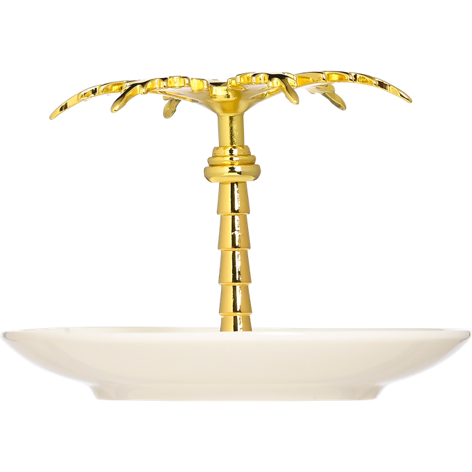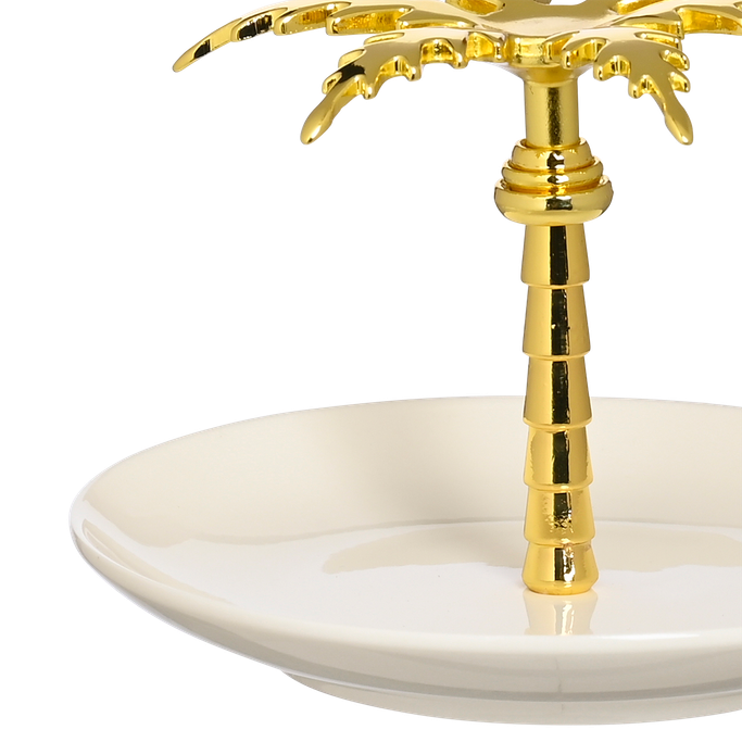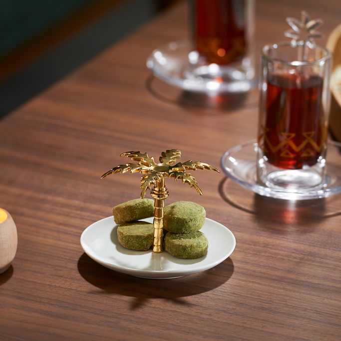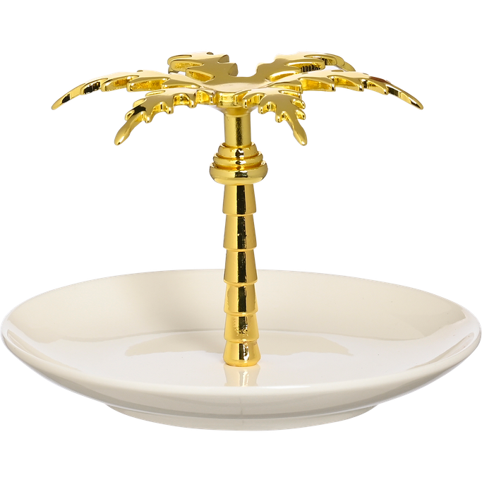 جمال النخيل. بالما طبق التمر صمم خصيصًا ليحمل التمر بكل جمال. اعرض تقديماتك بكل روعة واخلق انطباع مميز. مصنوع من السيراميك باللون الأبيض والذهبي وصممت بنخلة في وسطه. دع نسمات النخيل والعروبة تملأ مناسباتك.
