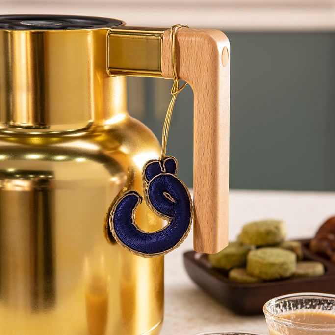 أضئ عينيك. أظهر خبرتك في التمييز بين دلال القهوة والشاي مع الأنيقة تعليقة قهوة. أضف رونق آسر على مناسباتك مع لمساتها الزخرفية التي ستسعد عينيك. طُرزت بظلال لامعة وتفاصيل دقيقة ساحرة لتأخذ جلسات القهوة الخاصة بك الى جو من الرقي. صُنعت بخيوط زرقاء وذهبية لملء منزلك بالبريق. استمتع بروعة تجمعات قهوتك بكل تفرد.