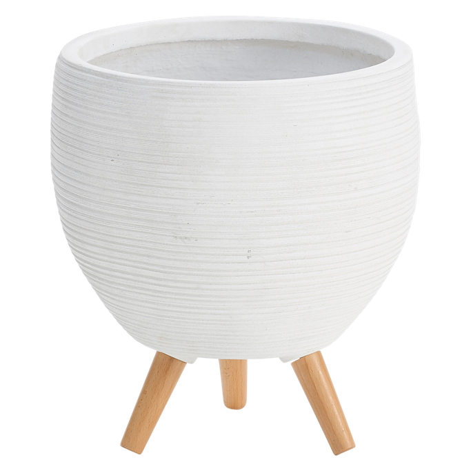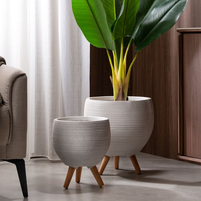 حديقة فردوسية. عبّر عن شخصيتك وذوقك من خلال عرض نباتاتك المفضلة مع المميز حديقة فايبر كلاي طقم أصيص. اخلق حديقتك المشرقة وتمتع بالأوقات والنسمات المنعشة. صُمم بنقوش مخططة فاتنة وأرجل خشبية بملمس فريد ومتألق يخطف الأبصار. يحتوي الطقم على أصيصين بحجمين مختلفين لتناسب أنواع مختلفة من النباتات كالأشجار والأزهار. صنع يدويًا من الطين باللون الأبيض وبتشطيب مطفي يضفي تناغم مدهش بين ديكورك. دع البهجة الخضراء تغمر أوقاتك وتريح روحك.