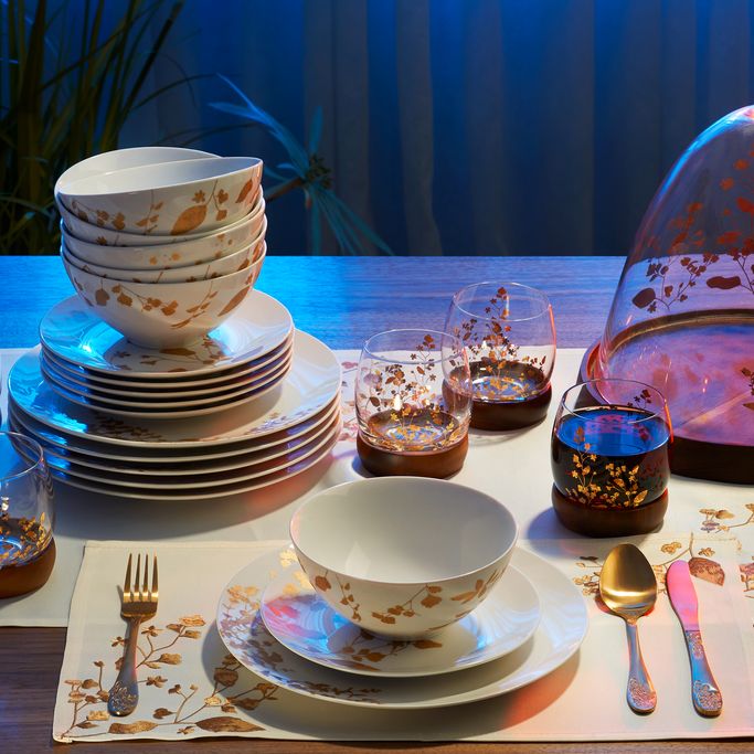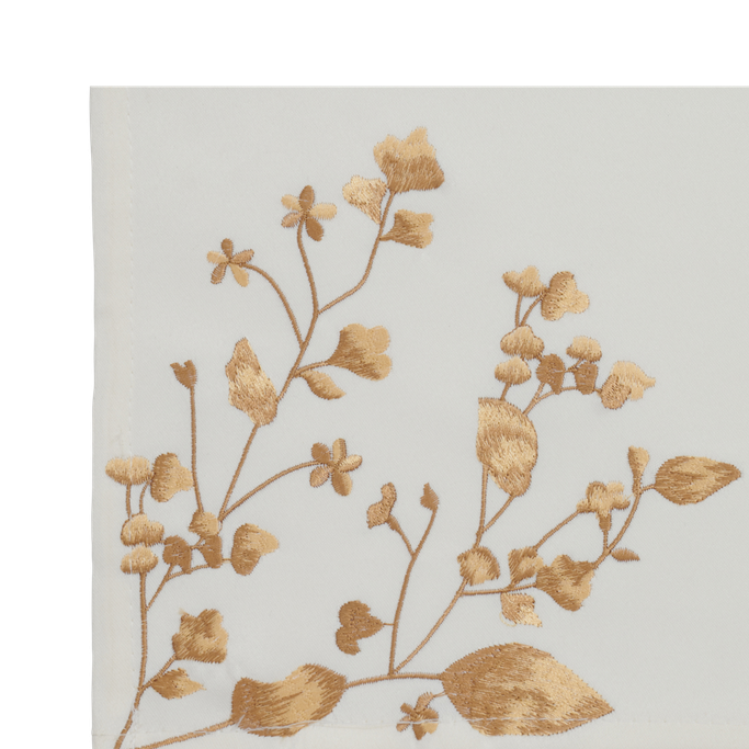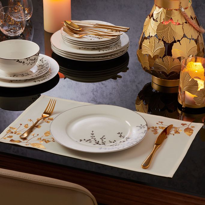 عندما تلتقي الرفاهية بالأناقة. مفرش طعام أوراق يغمر منزلك بأجمل الأزهار. مزيجه الفاتن بين تصاميم الأغصان والتطريز الذهبي يضفي طابع معاصر وحديث لإثراء كل زوايا مائدتك. مصنوع من قماش أبيض ورسومات ذهبية لأوراق الشجر والزهور التي تبرز أناقة ما حولها. سهل التنسيق ليناسب جميع مناسباتك وتجمعاتك وليُجمِل مساحاتك. جددي مجموعة التقديم الخاصة بك وأبهري ضيوفك بقطعة ستأسر قلوبهم.