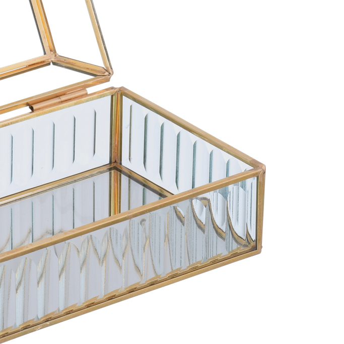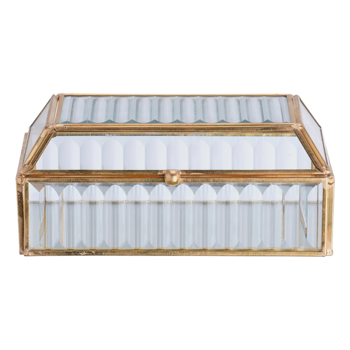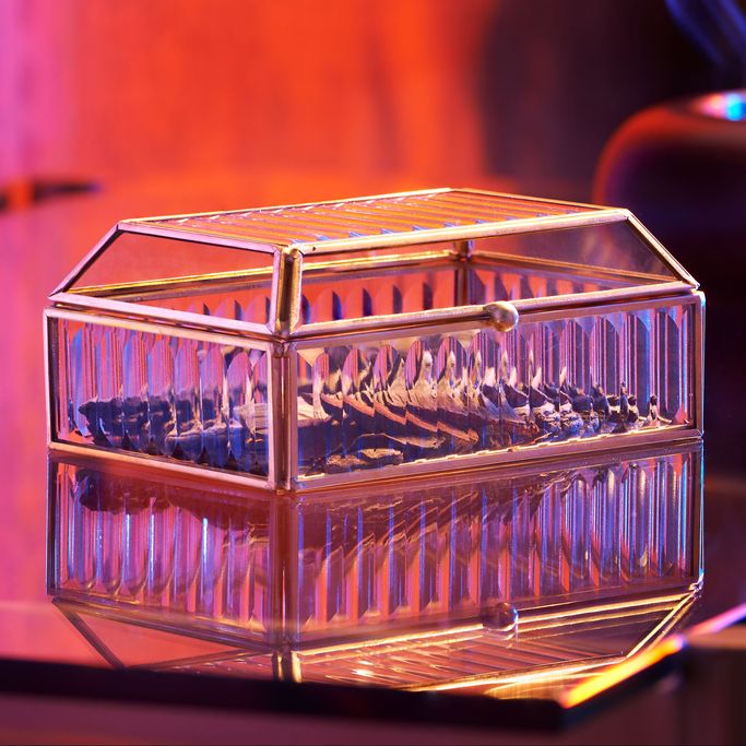 لمعان فاخر. بشكله الأنيق وخطوطه المثالية سيمونز صندوق ديكور يساعدك على تنظيم وحفظ كنوزك الصغيرة. دع زواياه الزخرفية تملأ منزلك بالروعة والأناقة في حينما يؤدي عمله في حفظ أشياءك. نسقه بجانب صينية أو مزهرية لإنشاء عرض من العناصر المزينة في مداخلك. بتصميم يتألق بتفرده ويفاجئك بحضوره الممتاز. صنع من الزجاج الشفاف مع حواف معدنية ذهبية وغطاء. حان الوقت لتجعل بيتك يلمع بشكل مشرق.