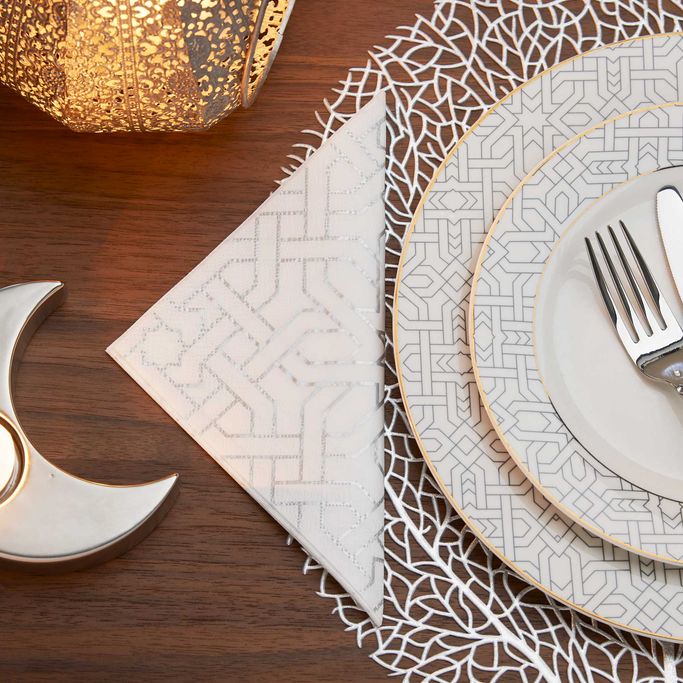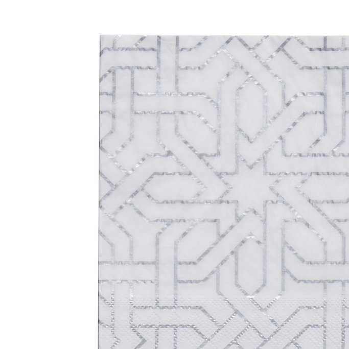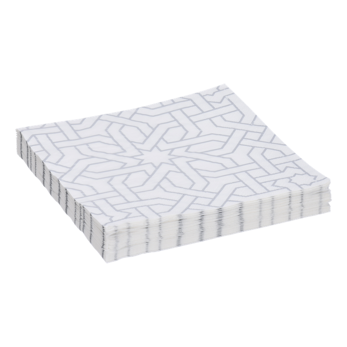 فنون إسلامية. كل مائدة تحتاج إلى مناديل مميزة بنقوش رائعة للمناسبات الخاصة وفري عناية جذابة لضيوفك الكرام. مناديل إسلاميكو يمكنك تزيين المائدة بها وصنع تفاصيل صغيرة مذهلة. لديك العديد من الطرق الإبداعية لتصنع أفضل تنسيق لطاولتك. مصنوعة من الورق برسومات .إسلامية فضية. ستغير الأجواء المحيطة بمائدتك