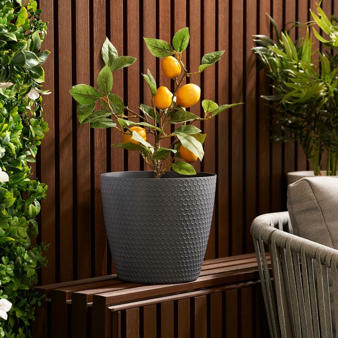 اصنع زاويتك الخضراء بلمسة عصرية مع خلية نحل أصيص زرع. صُمم بشكل دائري بسطح مزيّن بنقشة سداسية منتظمة تحاكي خلايا النحل. صُنع من البلاستيك باللون الرمادي. مثالي لتنسيق النباتات الداخلية أو الخارجية بأسلوب عملي ومُلفت.
