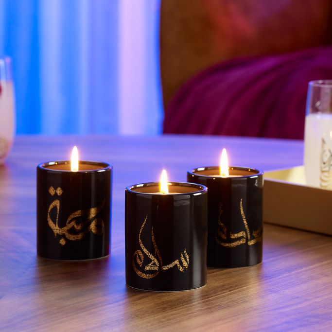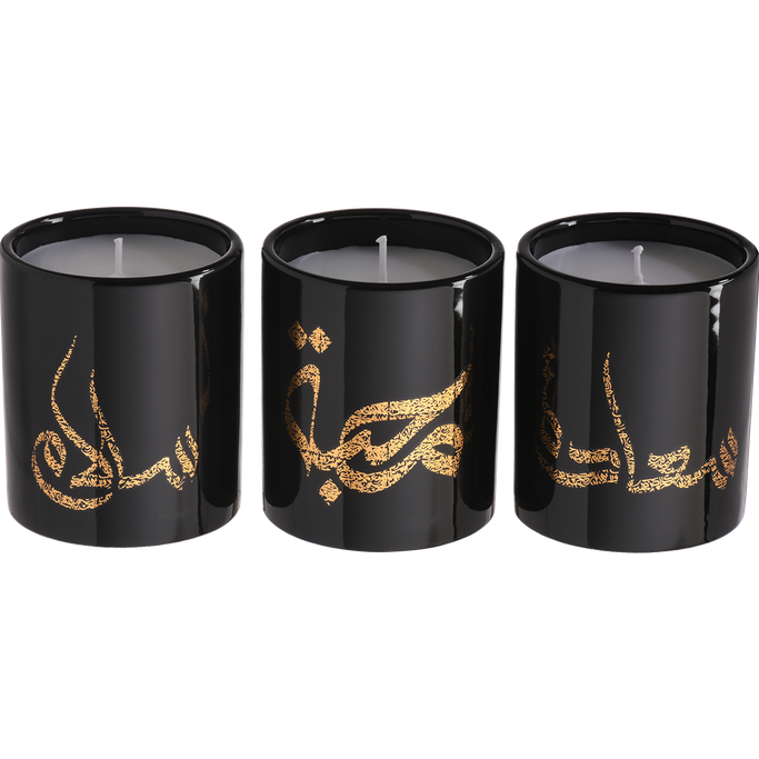 معاني المحبة والسلام والسعادة تتجسد في طقم ديواني لشموع المعطرة بكل شغف وأناقة. جماله مستوحى من الظلال الداكنة ليسرق أنفاسك بكل رقة. عطر بيتك بروائح تصنع أجواء متألقة وجذابة. صمم ليكرم الخط العربي ويبرز حرفته وتموجاته الفنية. صنع من السيراميك والشمع باللونين الأسود والذهبي ليعزز فخامته. دع العبير يملأ بيتك.