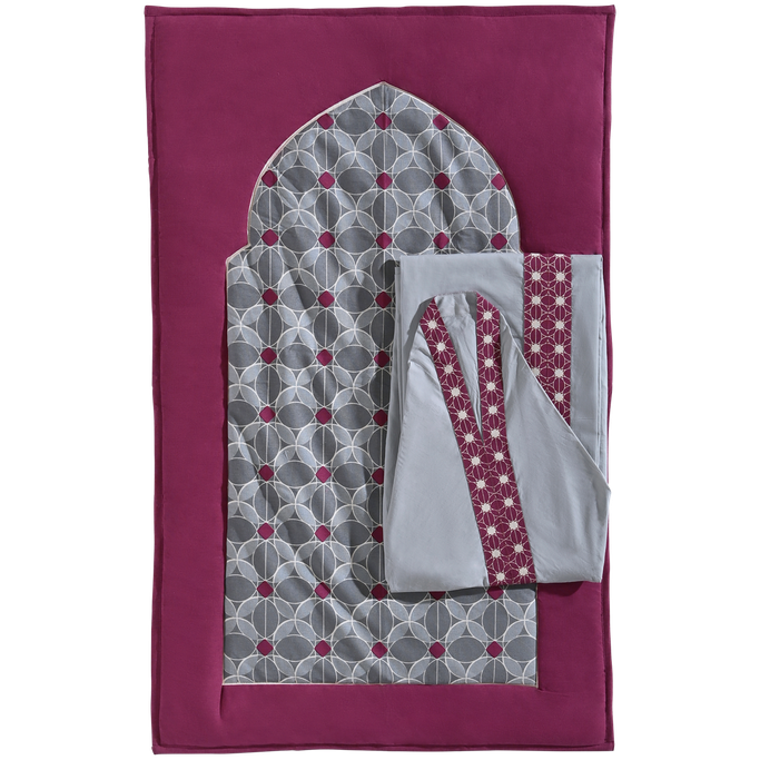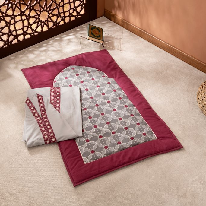 الخير يكمن في تفاصيل الحياة. استشعر لحظات الإيمان والطمأنينة في كل يوم مع مغربي ثوب صلاة. صممت المجموعة من قطعتين ثوب للصلاة بسحاب وسجادة بتصاميم إسلامية. صنع من البوليستر باللون الأحمر الغامق وبلمسات من اللون الرمادي.