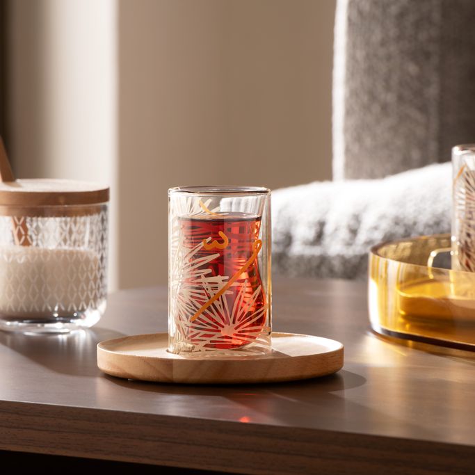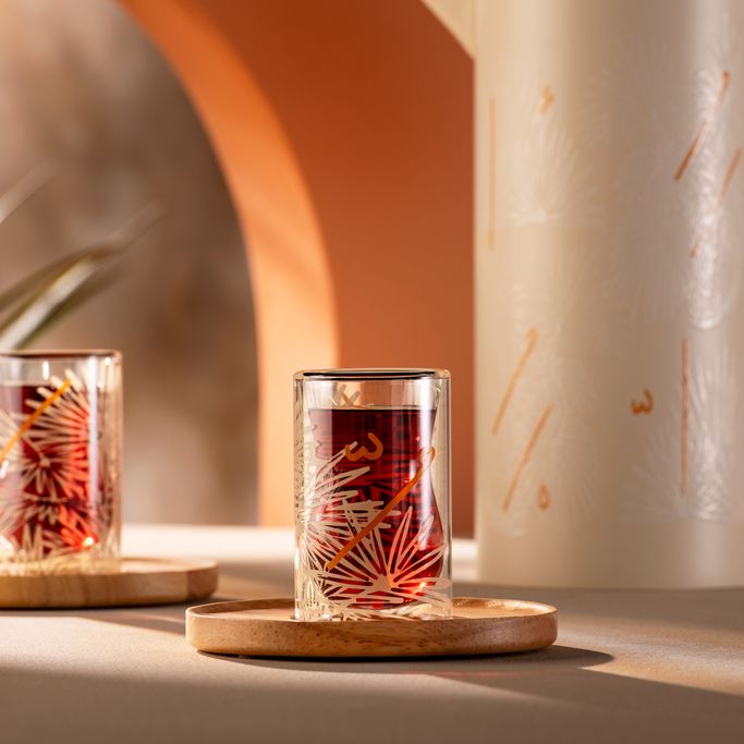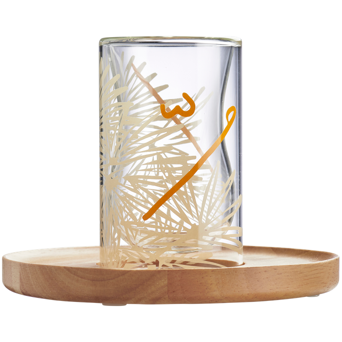 ارتقِ بلحظات الاسترخاء إلى آفاق جديدة من الجمال والتأمل مع نخيل طقم شاي. صُمم الطقم من فنجان شاي بطبقة زجاج مزدوجة، وطبق خشبي. صُنع من زجاج شفاف يحمل نقوشًا ذهبية تتراقص عليها الحروف العربية بإيقاع شاعري. دع هذه المجموعة تنسج قصصًا من الذكريات الجميلة حول مائدتك.