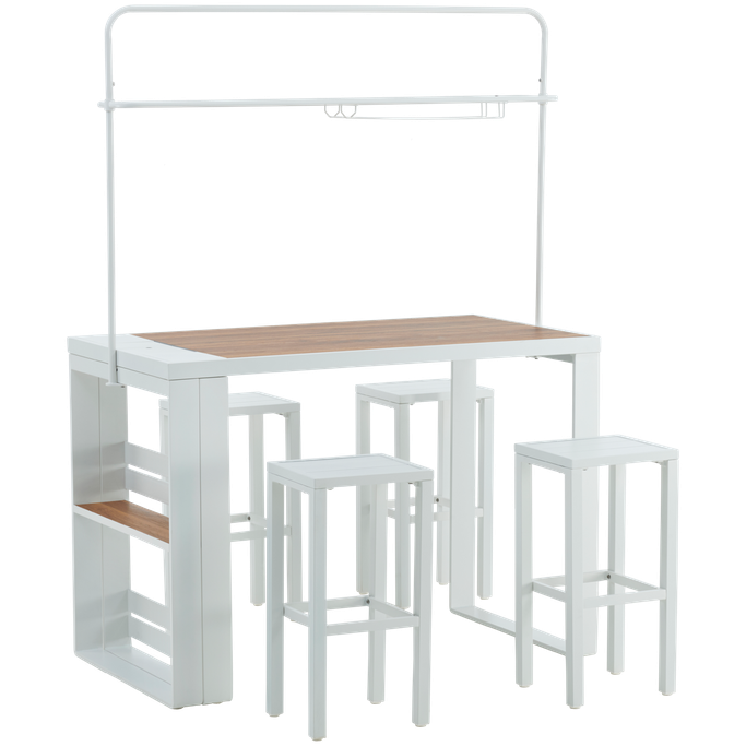 أبهر ضيوفك. اجعل مساحتك الخارجية متألقة مع جالا طقم طاولة طعام. صُممت الطاولة بسطح مستطيل مزودة بحامل أكواب عملي ورف جانبي لعرض ما يحلو لك، تكتمل روعة المجموعة بأربعة مقاعد مرتفعة. صُنعت من الألومنيوم باللون الأبيض الناصع مع لمسة طبيعية من الخشب. استمتع بمشروبك المفضل في أجواء من السعادة والمرح.