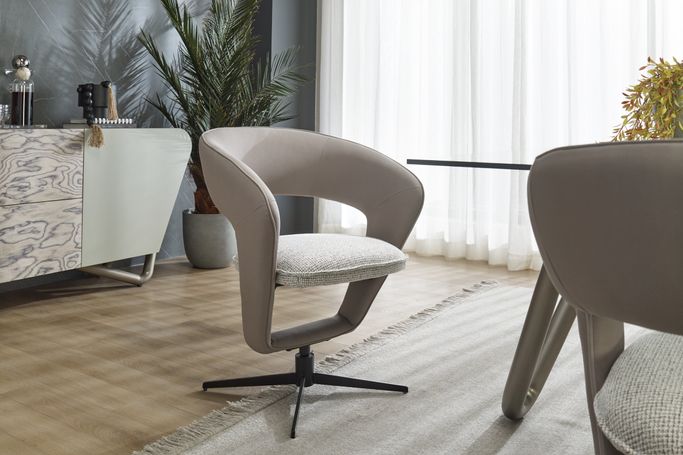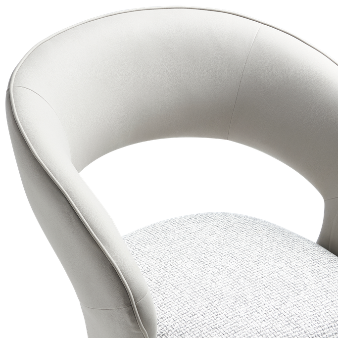 استمتع بتجربة طعام مليئة بالدفء مع فلو كرسي طعام. صُمّم بشكل هندسي عصري يتميز بظهر منحنٍ يلتف بانسيابية حول المقعد، مع قاعدة تدعم الثبات. صُنِع من الحديد، الإسفنج، خشب الأبلكاش، والقماش باللون الرمادي والأبيض. اجعل مائدتك محورًا للقاءات العائلية الجميلة.