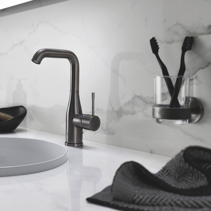 • تشطيب GROHE Long-Life: باللون الرمادي الغامق، مقاوم للتآكل ويحافظ على مظهره طويلًا.