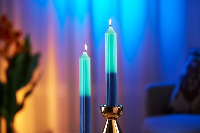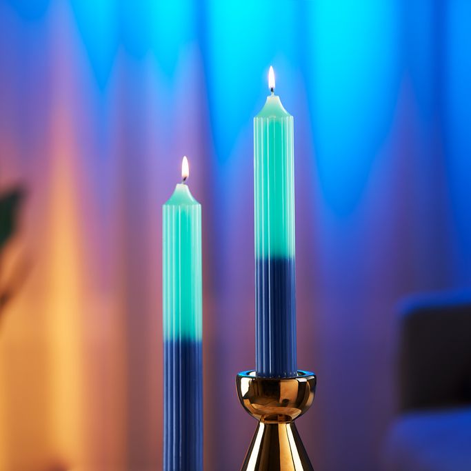 وهج الفخامة. انظر لتفاصيل الجمال الذي يتألق من مها طقم شموع. أضئ الشموع وانشر جو السكينة في بيتك. صمم بشكل ناعم مخطط بشكل عمودي. صنع من الشمع باللونين الأزرق والأخضر ليعطيك لمسة فخامة استثنائية. اجعل شموعك عنوان لفخامة بيتك.