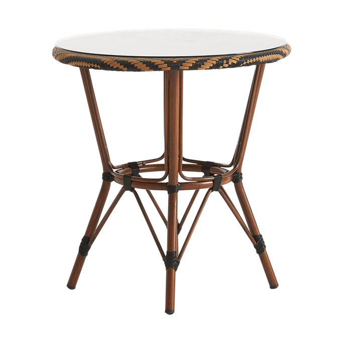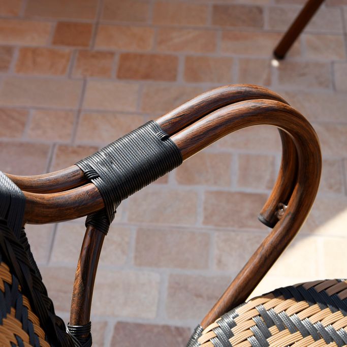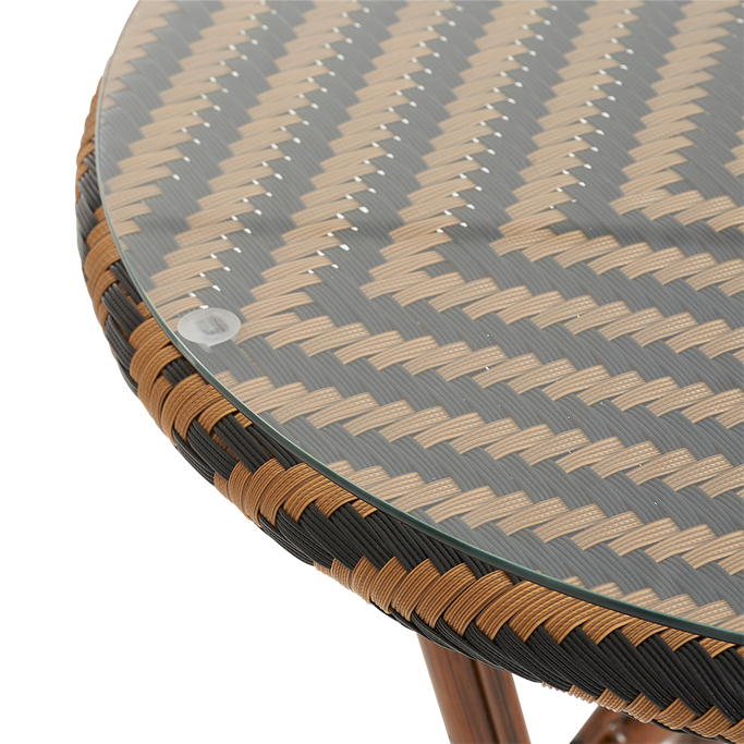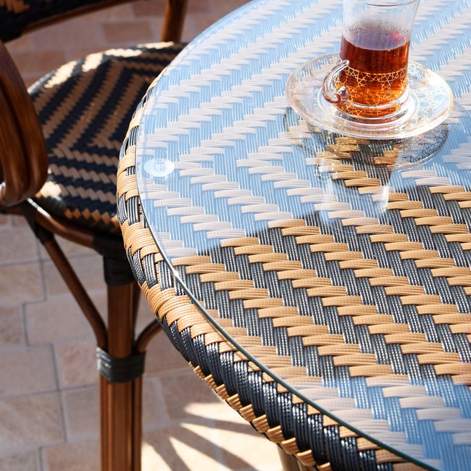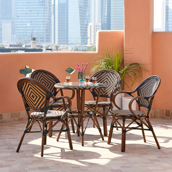 أمسيات باريسية. تمتع بسحر الأمسيات الباريسية الشاعرية مع طاولة طعام أولد باريس. احظَ بتجربة استثنائية في الهواء الطلق مع لمسات الراتان الأنيقة التي تجسد الجاذبية الكلاسيكية لمقاهي باريس. دعها تنقلك إلى زمان ومكان آخر بنمط الشيفرون الذي يعبق بتاريخ الثقافة الفرنسية. تعكس امتزاجات اللونين الأسود والبني طابع الفن التأثيري المبهر. صُممت بشكل دائري مع سطح زجاجي لتخلق لمعانًا وبريقًا أخاذًا. ابهر ضيوفك بالتناغم الرائع من الراتان والألمنيوم الذي يضفي أجواءً فنّية في فناء منزلك. اصنع ذكريات لا تنسى مع هذه القطعة.