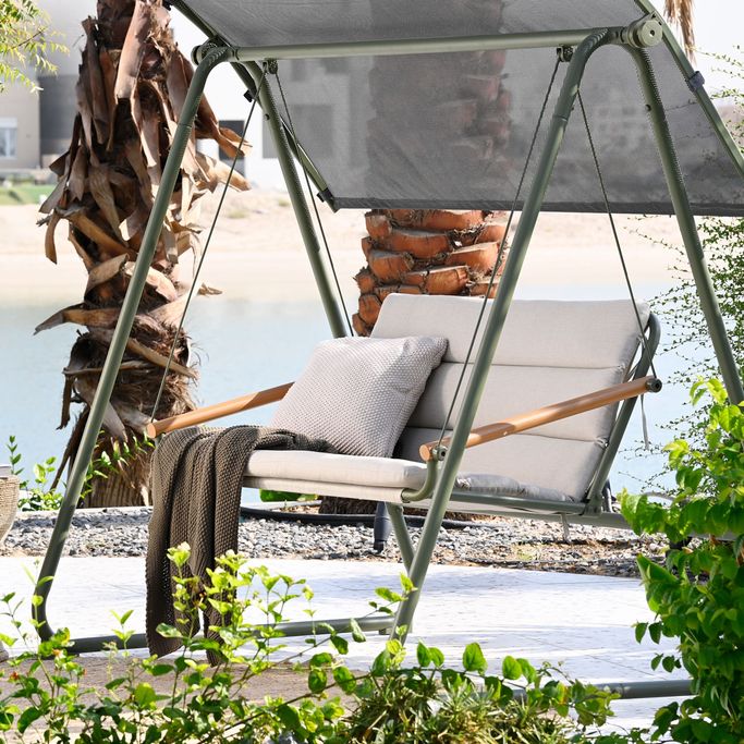 شارك من تحب لحظات من الاسترخاء الهادئ وسط الطبيعة مع فيرا أرجوحة. صُممت بمقعد مريح لشخصين، مع مظلة قماشية واسعة لتوفير الظل، ووسادة وثيرة وظهر مبطن مع أذرع جانبية أنيقة لضمان أقصى درجات الراحة. صُنعت من هيكل فولاذي متين باللون الأخضر، مع مساند ذراعين بلمسة خشبية لمظهر دافئ، ومظلة واقية باللون الرمادي. استمتع بأحاديث لا تنتهي مع حركة التأرجح اللطيفة.