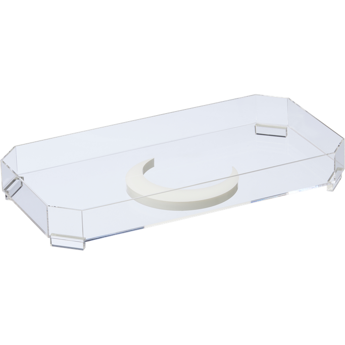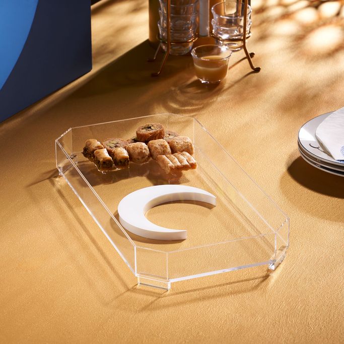 لمسات رقيقة. تأمل لمسة من الفخامة والتميّز على مائدتك الرمضانية مع آفاق طبق تقديم. صمّم على شكل هندسي وبحواف مرتفعة مع قواعد أنيقة تجمع بين الجمال والعمليّة مع رسم هلال على قاعدة الصينية. صنع من الأكريلك الشفاف لضمان الخفّة والقوة الفائقة. أضف لمستك الخاصة على مائدتك.