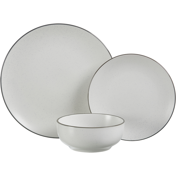 Soft as a Cloud. Discover the poetic charm of the Aasfa Dinner Set, a manifestation of soft beauty in every piece as a cloud. Designed with smooth surfaces, including a dinner plate, a side plate, and a soup bowl, bringing a touch of brilliance to your table. It is made from stoneware in a pure white hue, each element boasts delicate colored edges, adding a subtle burst of inspiration.