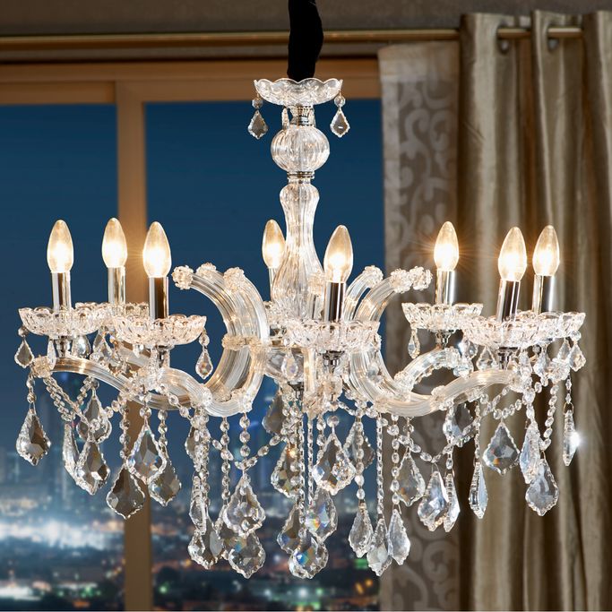A tale Of Elegance Expressed by the Maria Theresa Crystal Chandelier. Designed with precise details including multiple layers of crystal with harmonious curved arms. It is made from glass, crystal, and metal in a warm chrome color. Add captivating brilliance to your space.